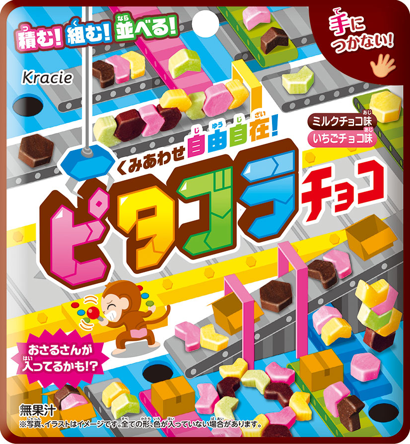 『パズルチョコ』は、4色の超ミニ・サイズのパズル・ピースを繋げて遊べるチョコレート菓子。リニューアルにあたり、ピースの種類が全5種に増え、繋げ方のヴァリエーションも増加。『ピタゴラチョコ』は、4色の矢じり型と正六角形型。並べる、積むなどの組み合わせで自由自在に遊べます。