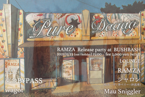 持ち前のジャンルレスかつ一貫した美学を落とし込んだ最新ミックス作品『Pure Daaag』を10月に東京・小岩 BUSHBASHのレーベル・ラインより発表したRamzaが、11月23日(火・祝)に同作のリリース・パーティをBUSHBASHにて開催。