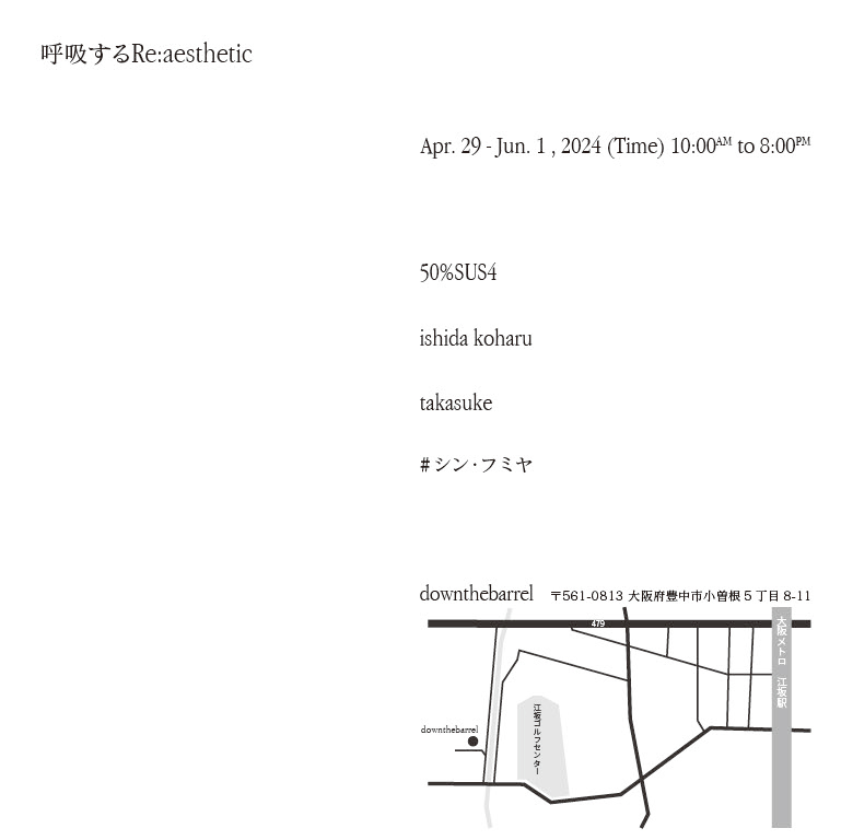 米「SKiN GRAFT Records」からのワールドワイド・デビューが話題となっているHYPER GAL(w/ 角矢胡桃)の一員としてのみならず、昨年の個展「存在するとは別の仕方で」が好評を博した美術家としても活躍する石田小榛と、「BECOMING Studio」によるヴァーチャルアーティスト・シン©︎Kのディレクション / プロデュースワークが話題となっている#シン・フミヤ、写真 / グラフィックを手掛けるtakasukeが、グループ・エキシビション「呼吸するRe:aesthetic」を4月29日(月)から6月1日(土)にかけて大阪・天神橋 江坂 downthebarrelにて開催。
