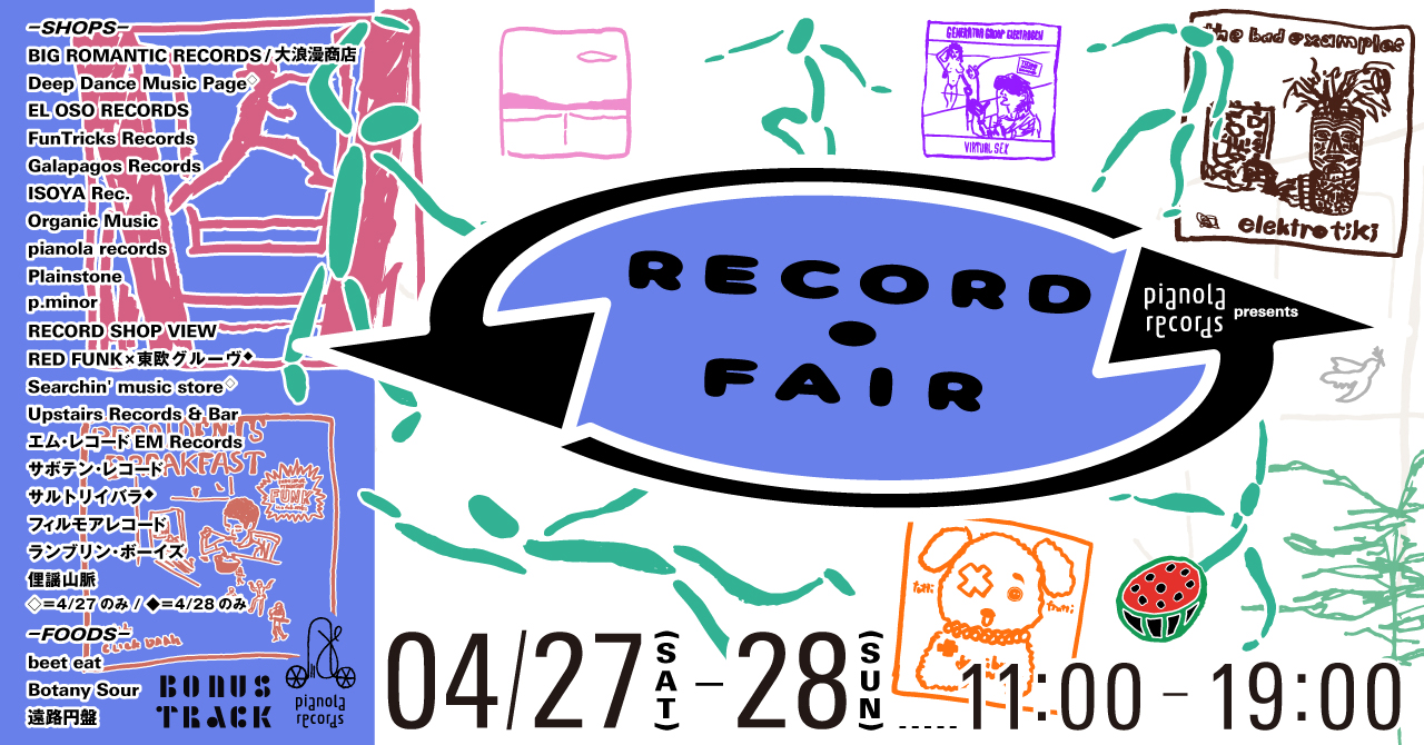 BONUS TRACKと、同施設内に店舗を構えるレコード・ストア「pianola records」が共催する同イベントには、「BIG ROMANTIC RECORDS 大浪漫商店」「Deep Dance Music Page」(27日のみ)「EL OSO RECORDS」「FunTricks Records」「Galapagos Records」「ISOYA Rec.」「Organic Music 」「Plainstone 」「p.minor」「RECORD SHOP VIEW」「Searchin’ music store」(27日のみ)「Upstairs Records」「エム・レコード(EM Records)」「サボテン・レコード」「サルトリイバラ」(28日のみ)「フィルモアレコード」「ランブリン・ボーイズ」や、山中 明(RED FUNK)とヨハネス市来(東欧グルーヴ)による「RED FUNK x 東欧グルーヴ」(28日のみ)、DJデュオ・俚謡山脈が出店。加えて、東京・喜多見のジビエ / カレー・レストラン「beet eat」、果物とスパイスを使用したクラフト・サワーのバー「Botany」、ハンバーガーを中心に提供する「遠路円盤」によるフード出店も予定されています。