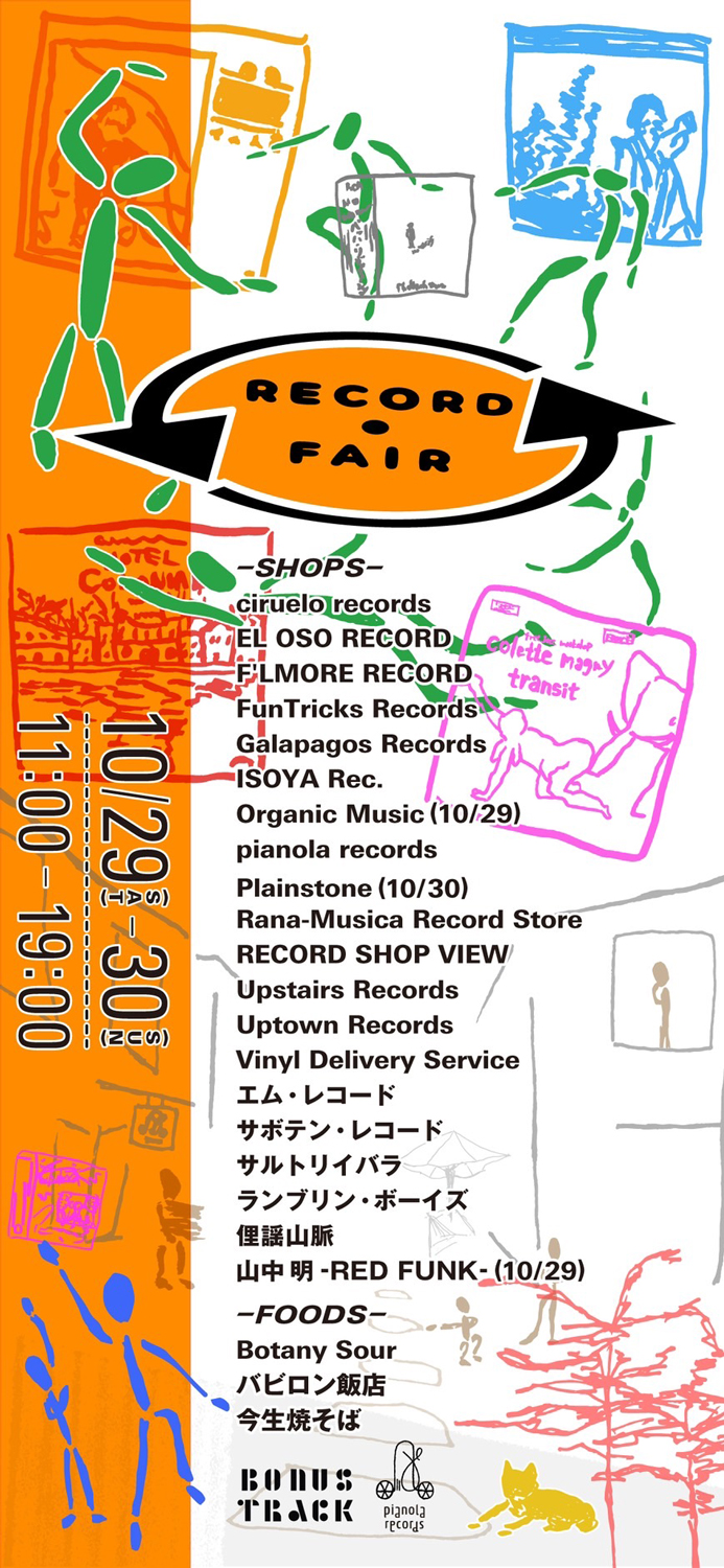 今春開催された第3回に続いて4度目の開催となる同イベントには「pianola records」のほか、「ciruelo records」「EL OSO RECORDS」「EM Records」「F'lmore Record」「FunTricks Records」「Galapagos Records」「ISOYA Rec.」「Organic Music」「Plainstone」「Rana-Musica Record Store」「ランブリンボーイズ」「RECORD SHOP VIEW」「Saboten Records」「サルトリイバラ」「Upstairs Records」「Uptown Records」「Vinyl Delivery Service」や、俚謡山脈、山中 明 (RED FUNK)が出店。加えて、PLASTICMAIによる移動式飯屋「バビロン飯店」、果物とスパイスを使用したサワーを提供する「Botany」、お祭でも定番のソース焼きそばを提供する「今生焼そば」のフード出店も予定されています。