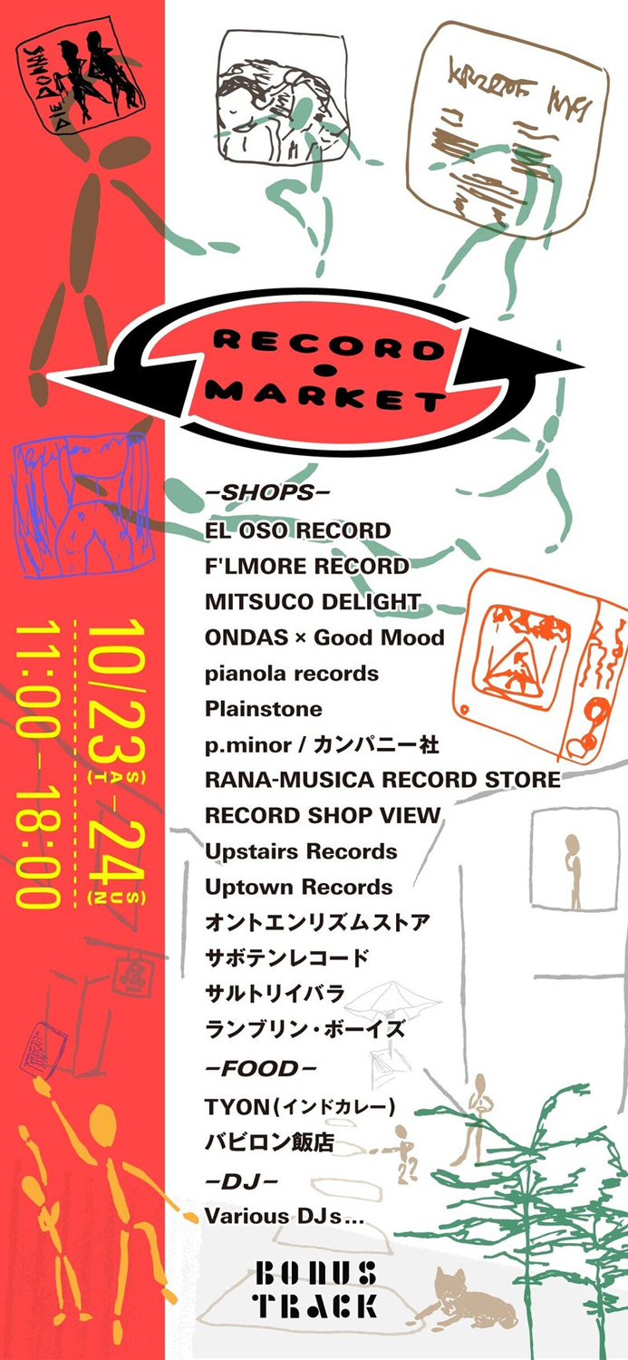 春に開催された初回に続いて2度目の開催となる同イベントには、pianola recordsをはじめEL OSO RECORD、F’LMORE RECORD、MITSUCO DELIGHT(23日のみ)、ONDAS × Good Mood、オントエンリズムストア(23日のみ)、Plainstone、p.minor カンパニー社、RANA-MUSICA RECORD STORE、ランブリン・ボーイズ、RECORD SHOP VIEW、サボテンレコード、Upstairs Records、Uptown Recordsの14店が出店。「TYON」がカレー、PLASTICMAIによる移動式飯屋「バビロン飯店」がパテやジャムやペーストなどのフードを提供するほか、23日にはDUBBY、Kuyama、Sam Fitzgerald、themaki、塩尻寄生、24日にはBANANA、EMARLE、李 ペリー、Meizin、polkwaysによるDJも予定されています。
