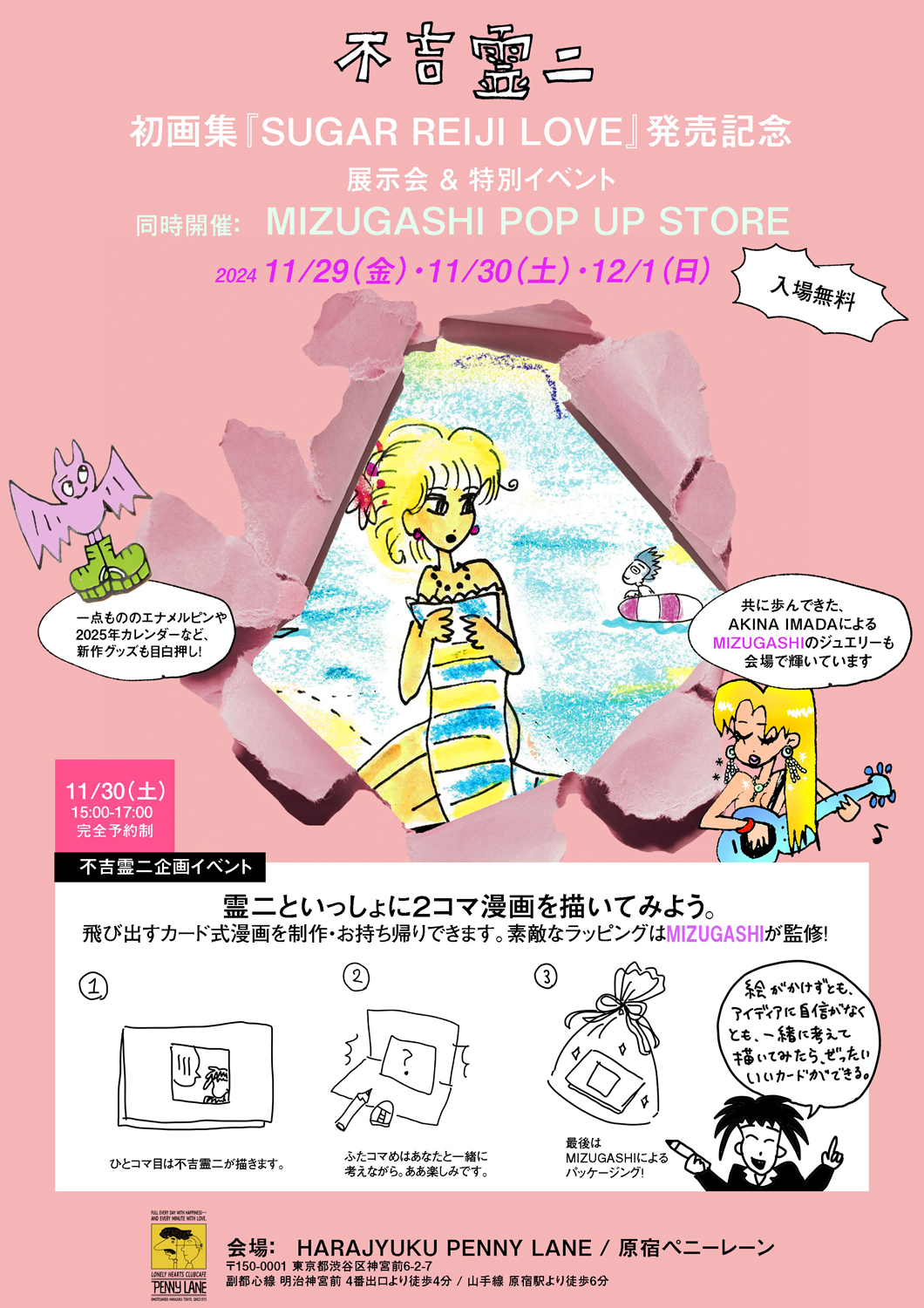 初の作品集『SUGER REIJI LOVE』(フルカラー | 100頁)を刊行する漫画家 / イラストレーター・不吉霊ニと、ジュエリーデザイナー・今田安希奈によるブランド「MIZUGASHI」が、『SUGER REIJI LOVE』の発売を記念した共催での展示会を11月29日(金)から12月1日(日)にかけて東京・原宿ペニーレーンにて開催。