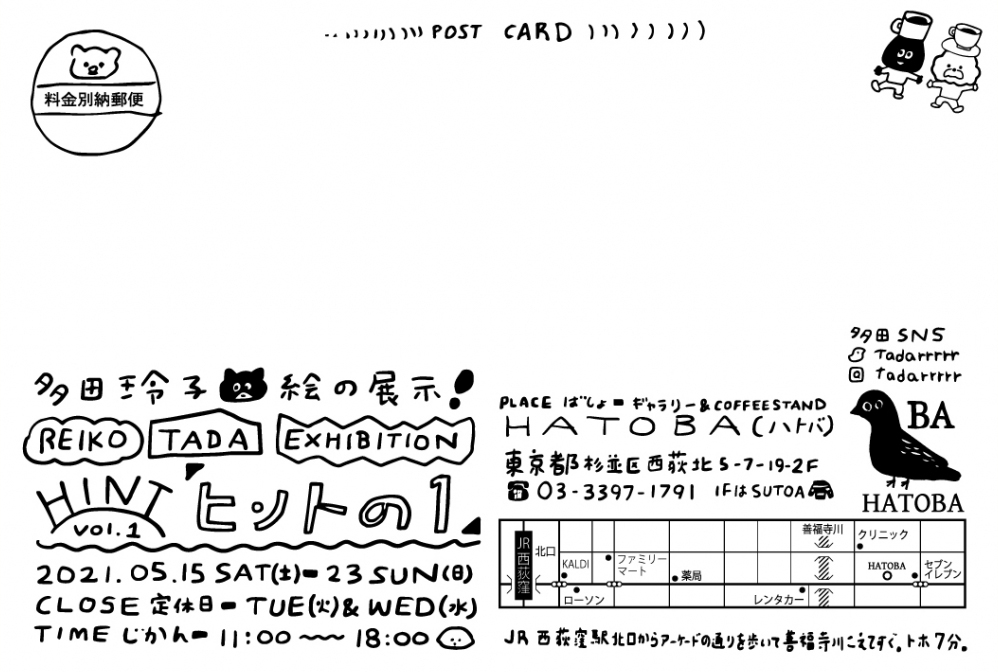 コミック・ジン『ちいさいアボカド日記』シリーズや、東京都現代美術館のリニューアル・オープン・ポスター(2018)、NHKラジオ第1 / NHK FM「岡村靖幸のカモンエブリバディ」のロゴなどで知られるイラストレーター・多田玲子がソロ・エキシビション「ヒントの1」を東京・西荻窪 HATOBAにて5月15日(土)から23日(日)まで開催。