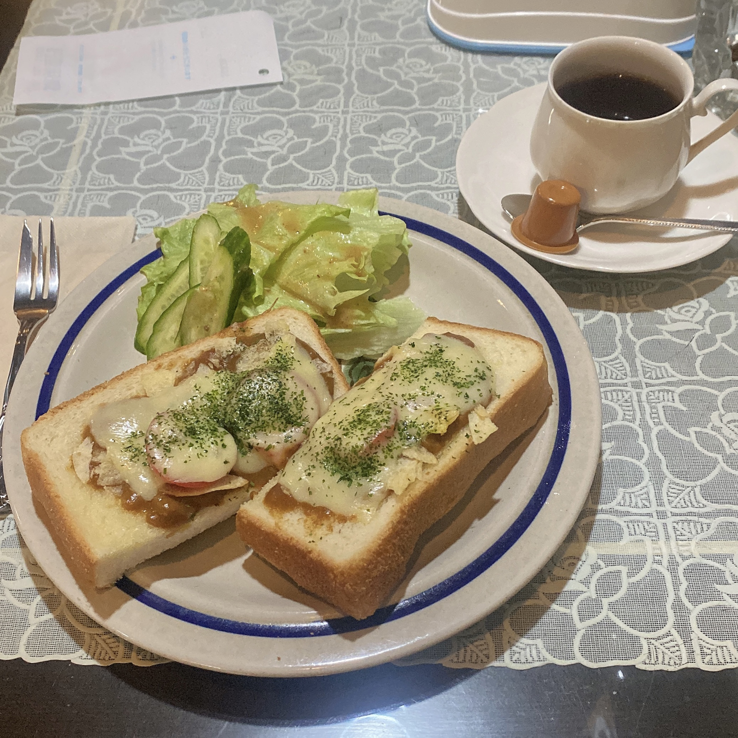 柔らかいトーストにお家味のカレー、チーズ、さらにはトマト。とってもおいしい!ふんわりとした食感なので後何枚でも食べてしまいたいほど。。。ほどよい苦味がクセになるホットは、食事との相性がぴったりで、嫌な後味が残らないスッキリさも兼ね備えている。おばあちゃんがゆっくりと淹れてくれたんだから、おいしいに決まっている……!