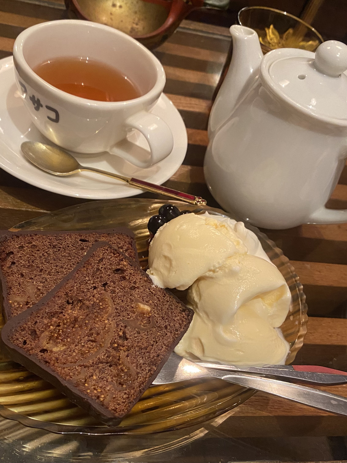 お待ちかねのパウンドケーキが到着!ドリンクのダージリンティーはポットで届きたっぷりの量。お待ちかねを口に運ぶ。……今まで食べたあらゆるパウンドケーキの中で一番好み!!!!! 20代ラストを飾り生活し続けている今の私が一番好きなパウンドケーキに(胃に負担もないぞ!)出会った。ふんわりと、お上品な味わいのパウンドケーキを端から支えるチョコレート。チョコレートの部分と一緒に生地を口に運ぶとほんっとうにおいしい。これぞ神配分。さらにほんのりとした甘みのアイスクリームにちょこんとディップして食べ進める。おいしい時間が続く。幸せな気持ちだ。