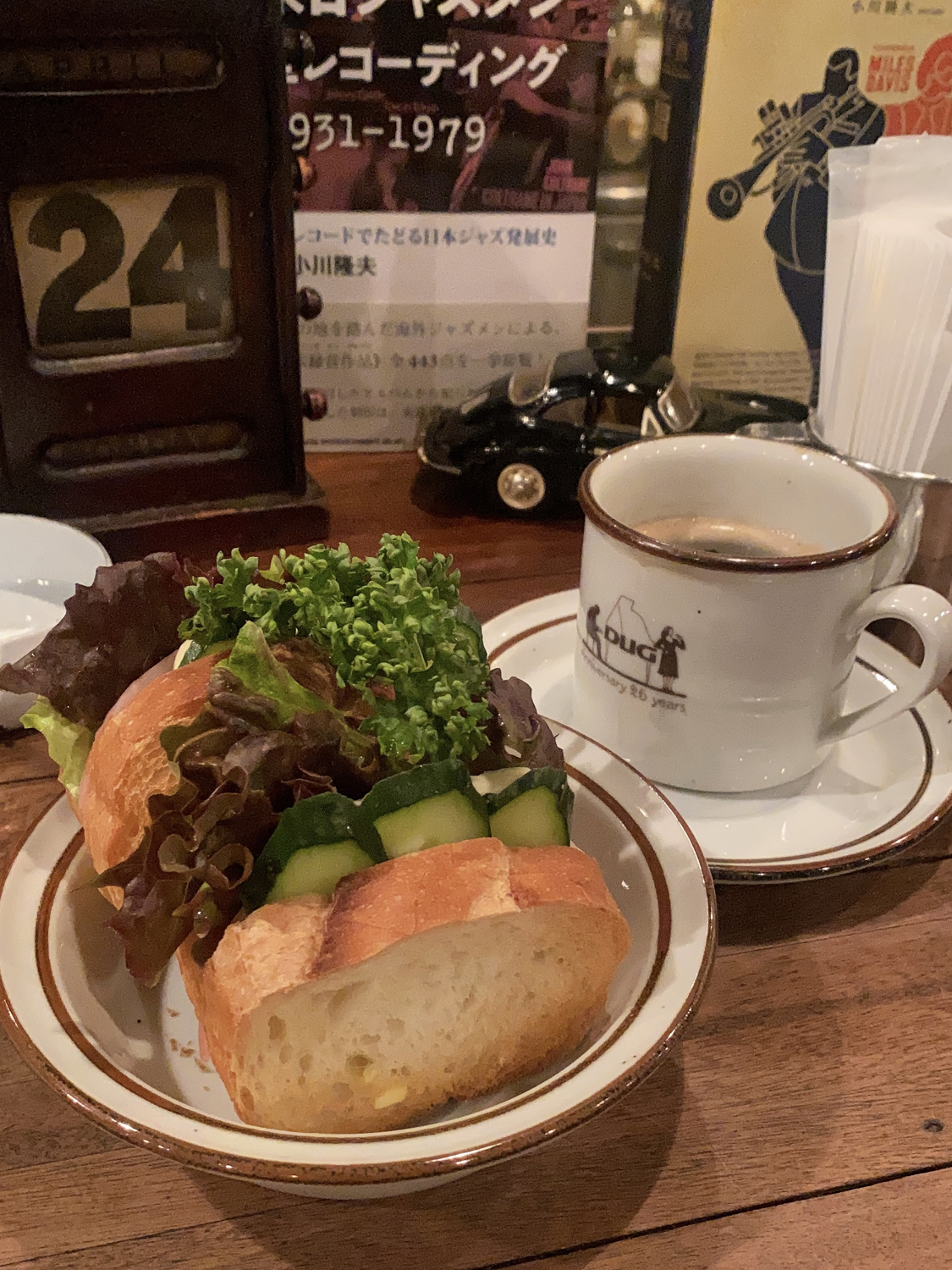 メニューも充実していて、今回は「ダグットサンド」とブレンドを注文。待っている時間も耳に良質なジャズが入ってくるからぜんぜん退屈しない。店内には歴史あるポスターが飾られていたり、ジャズに関する書籍があったりと、ギラついた新宿とは正反対の音楽秘密基地みたいなお店だと思った。