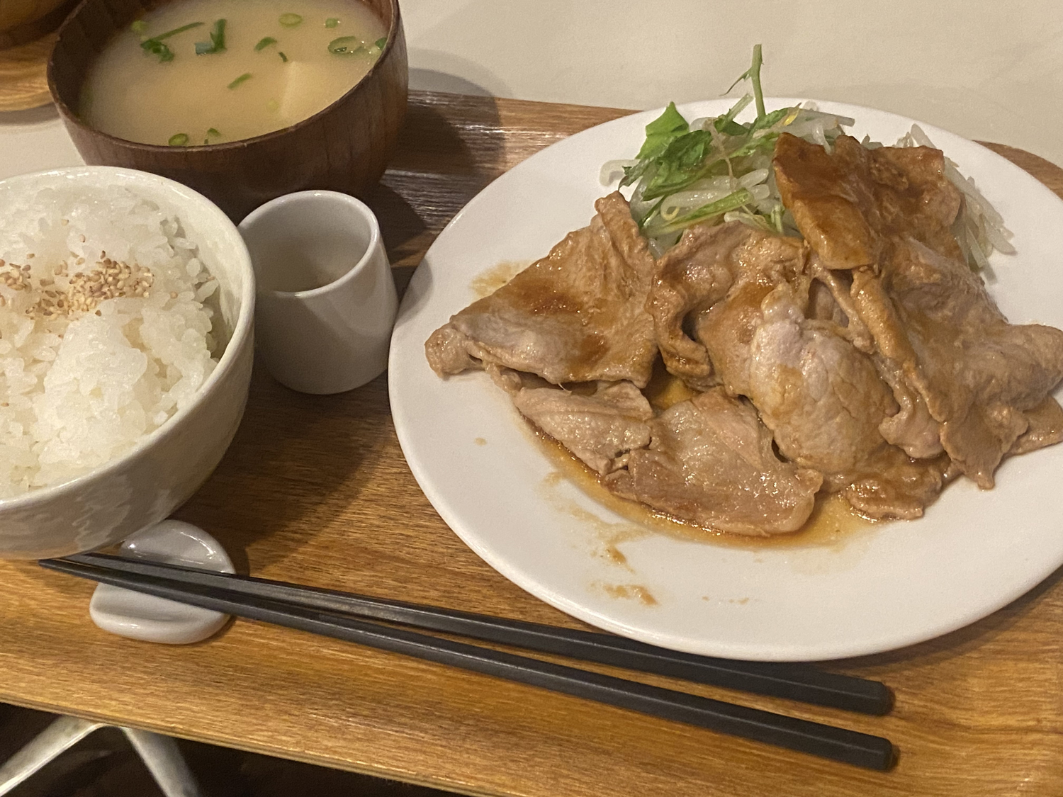 注文からほどなくして、お待ちかねの生姜焼き御膳が到着!with アイスレモンティー!待ち時間は5分ほど?だった気がする。お腹が減っていたのでありがたいファストさだ。