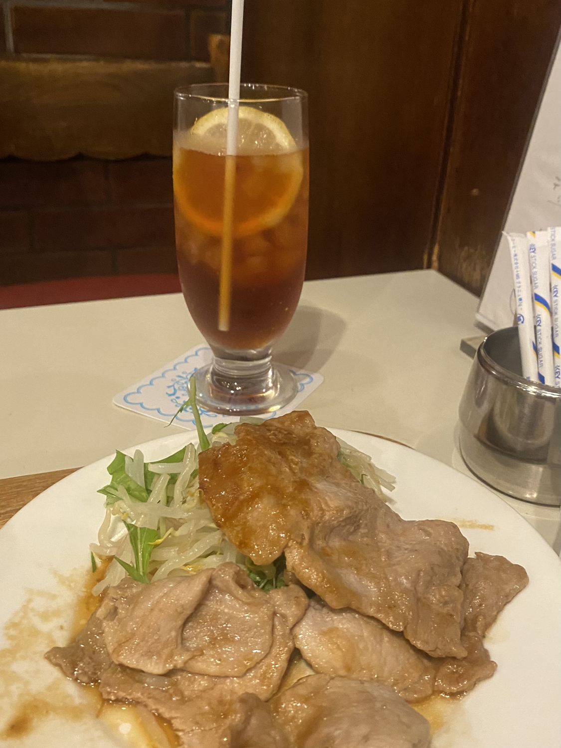 これまでこの連載であらゆる写真を撮ってきたが、生姜焼き越しのレモンティーは初めてではないだろうか。美しい日本の風景だ……。特製のタレが絡んだ生姜焼きが美味しくてご飯が進む。水菜ともやしのお野菜がたっぷりで、なんだかカロリーへの罪悪感も薄れる!昔ながらの喫茶店にはこういう定食(御膳)メニューが多い。喫茶店というと、ナポリタン、オムライス、トーストサンド……洋風なお食事が思い浮かぶが、本当に昔から営んでいる喫茶店ではおいしい定食が食べられる。