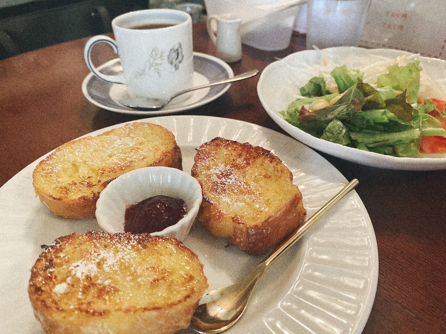 ぎゃー。美しい……。てっきり四角いタイプのフレンチトーストかと思い込んでいたために、ピカピカかつカリカリに焼かれた丸型のフレンチトーストによだれが止まらない。そのまま食べると染み込んだバターの風味が際立ち、味変とでも言おうか、ジャムをつけると上品な甘さが口いっぱいに広がる。普段フレンチトーストを食べると、バターや砂糖、卵液がしっかり染み込みすぎてやや胃もたれ状態になることもあるが、サラダと合わせて食すとちょうど良い量で、女性に優しいセットだ。セットのホットコーヒーのカップがとても可愛くてうっとりしたのは言うまでもない。