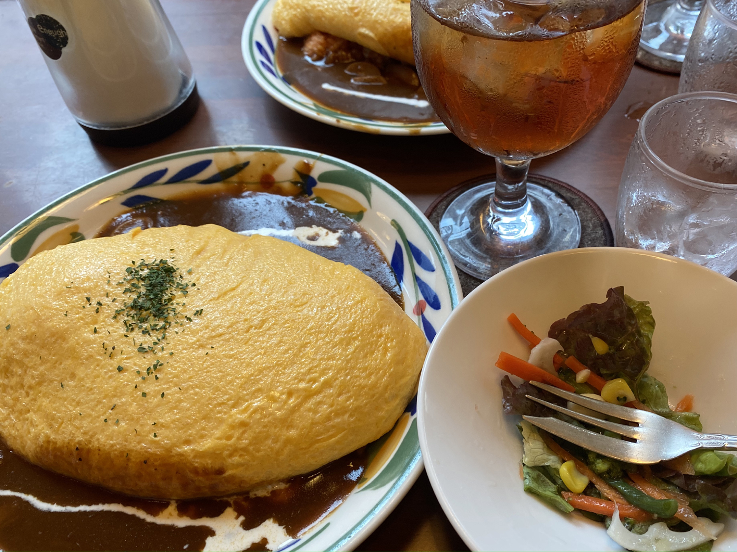 卵のコクが口全体に広がる。そこに流し込むスッキリとした口当たりのお紅茶は相性抜群だ(飲み物もお揃いの3人)。めちゃくちゃ美味なこのオムライスのおかげで黙食がはかどる3人。食べているうちに疑問が生まれてくる。「果たして何個の卵を使っているんだろう?」きっちりと毎日主婦をされているスタイル抜群お姉さんが代表して店員さんに聞いてくれた。ここに書くのは控えておきますが一旦ドン引きした3人がいたことだけここに記しておきますね。^ ^(でもドン引きする個数の卵を使わないと唯一無二のこのフワフワ卵は作れないんだろうなア)。