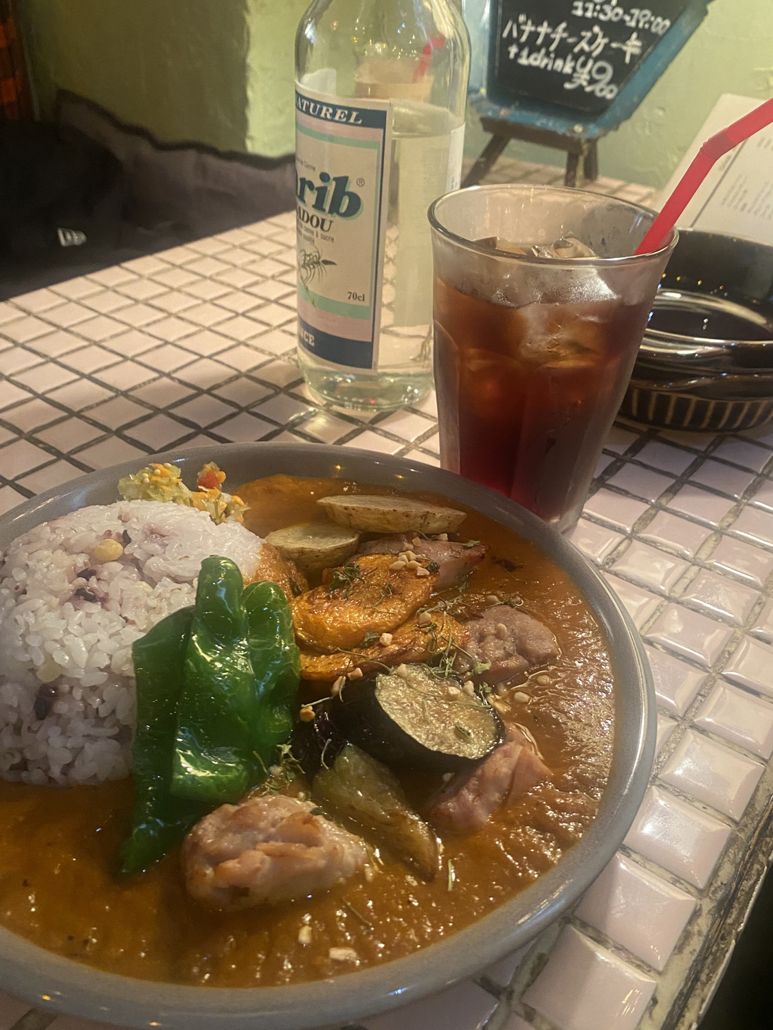 まろやかな辛さの中に、旨みがギュッと凝縮されていて本っ当に美味しい!!! お米が雑穀米なのもかなり嬉しい。。続いて、チキンをひとくち。……!!!!! ジューシーでしっかりとした味付けのチキンがさらに食欲を邁進させる!おいしすぎるよ!!! 素揚げ野菜はサクリとしていて、さすがは注文してから揚げているからこその旨み……。ナスにピーマンにサツマイモにニンジン。色とりどりの野菜たちがわたしに幸せをくれる!スッキリとした口当たりのアイスコーヒーでさっぱりとした後味のままお店を後にする。後ろの席のお客様が食べていたハンバーグカレーがかなりおいしそうで、次回は必ずこれにするのだ。