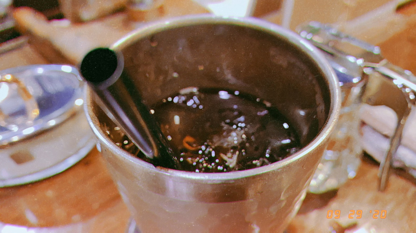 インディアンスパでお腹いっぱいになった後は、スペシャルブレンドコーヒーをアイスで。スパとセットで頼むと200円で食後のドリンクがいただける。目が冴える少し濃い目のブレンドコーヒーがFLORIANならでは。アイスコーヒーが注がれるこのギンギラギンの頑丈なグラスが個人的にすごく好き。めちゃくちゃ冷やしてくれそうで潔い!