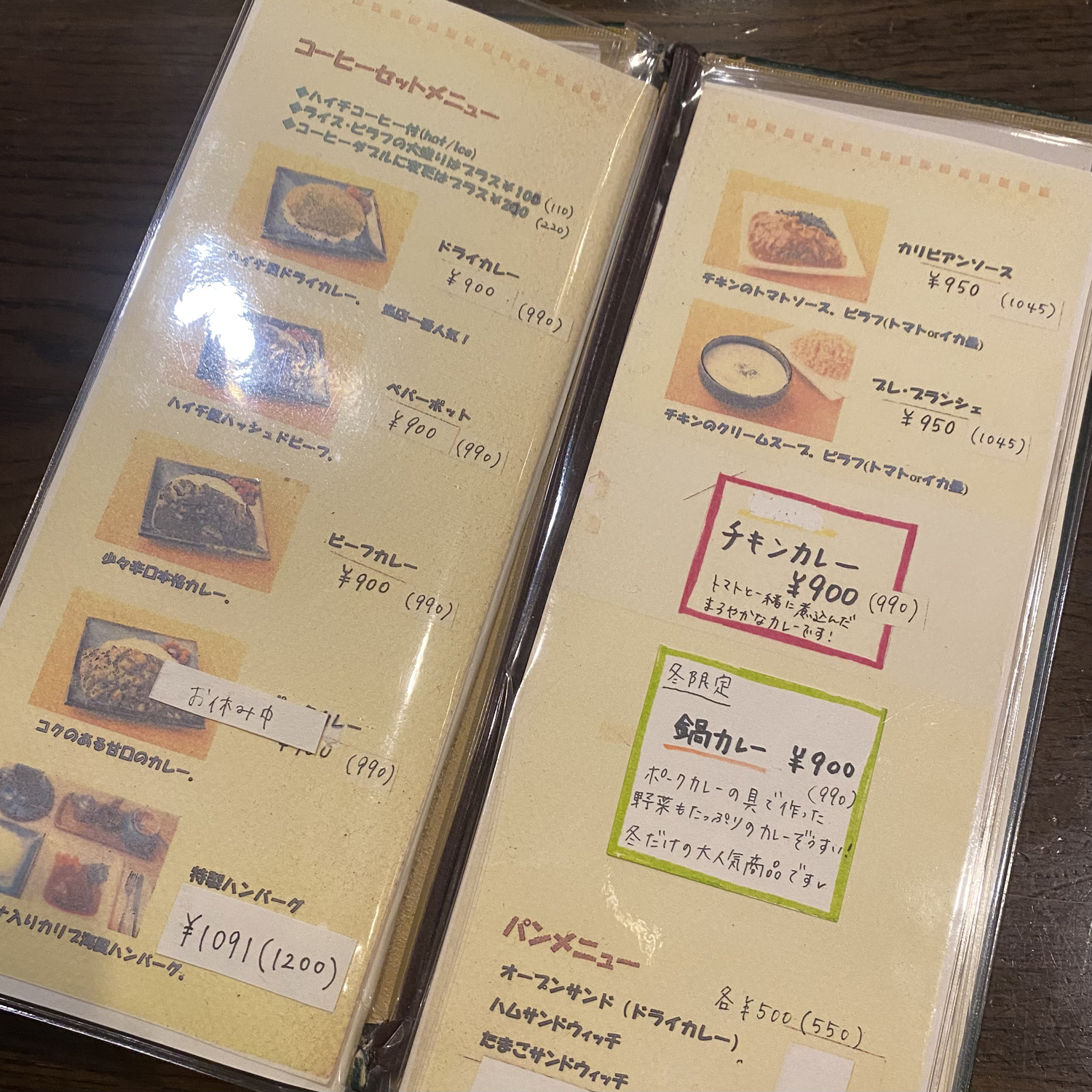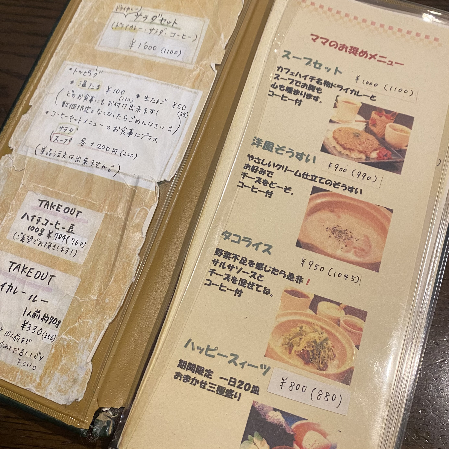 もともと新宿にあった1974年創業の「カフェ・ハイチ」本店は、2016年に中野へと移転。今回訪れた新宿センタービル店はフランチャイズの形態だという。壁に貼られた手作りのメニュー表やメニューに添えられてる文字に人の温かみを感じる。わたしはおすすめされたドライカレーと、ハイチコーヒーアイス、そして自家製グレープフルーツのプリンをいただいた。ハイチでの豪遊。