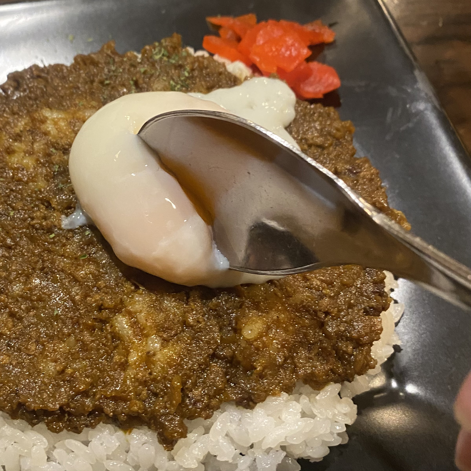 野菜の甘みがギュッと詰まったドライカレーはちょっぴり贅沢に温玉をトッピングして。何時間も煮込まないと出会えない旨みに感動する。辛さは控えめで、福神漬けとの相性もバッチリだ。美味しすぎて一瞬で食べ切ってしまった……。世が世なら、許されるなら、余裕でもう一杯食べてしまうほど美味しかった……。