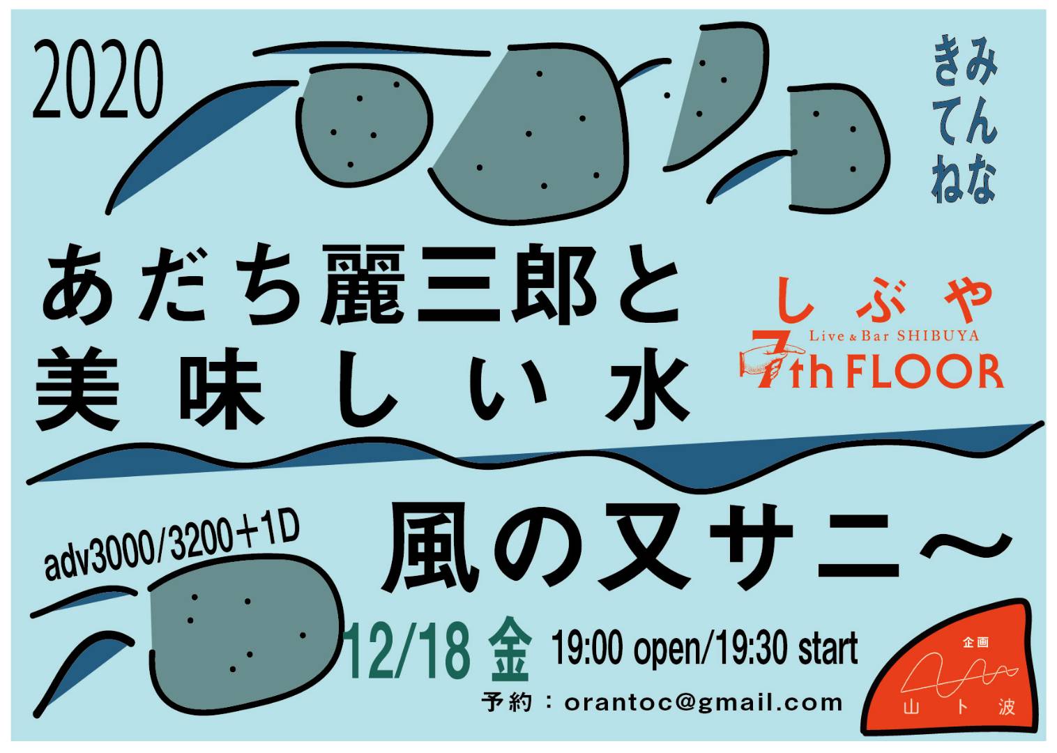 “からだの研究家”でもある音楽家・あだち麗三郎(冬にわかれて)率いる“あだち麗三郎と美味しい水”と、今成哲夫(vo)を中心に2009年から活動する京都出身の“風の又サニー”による2マン・ライヴが12月18日(金)に東京・渋谷 7th FLOORで開催されます。