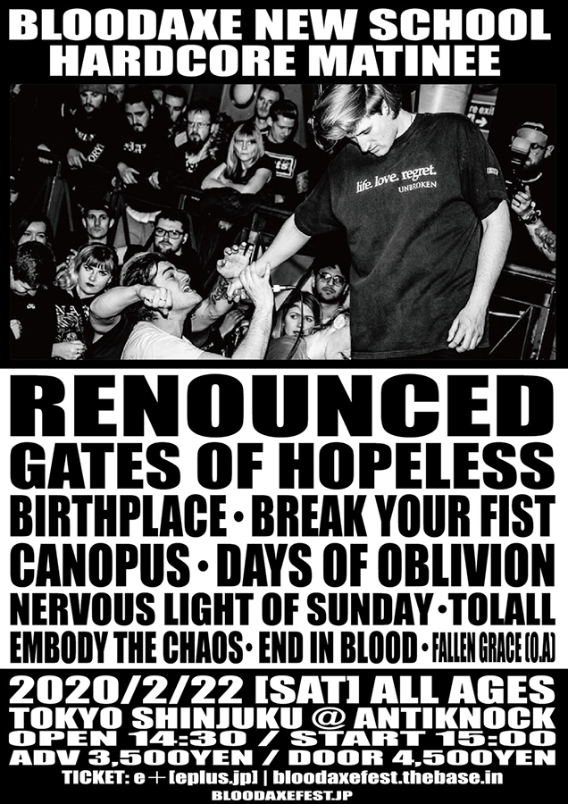 ツアーは2月21日(金)東京・新宿 NINE SPICES、22日(土)東京・新宿 ANTIKNOCK、23日(日)京都・四条大宮 Studio246 KYOTO、24日(月)大阪・西心斎橋 CLAPPERの全4公演。BIRTHPLACE、BREAK YOUR FIST、CANOPUS、DAYS OF OBLIVION、EMBODY THE CHAOS、END IN BLOOD、NERVOUS LIGHT OF SUNDAY、TOLALL、FALLEN GRACEが出演するANTIKNOCK公演は、「Bloodaxe New School Hardcore Matinee」と銘打った15:00開演のマチネーとなっています。
