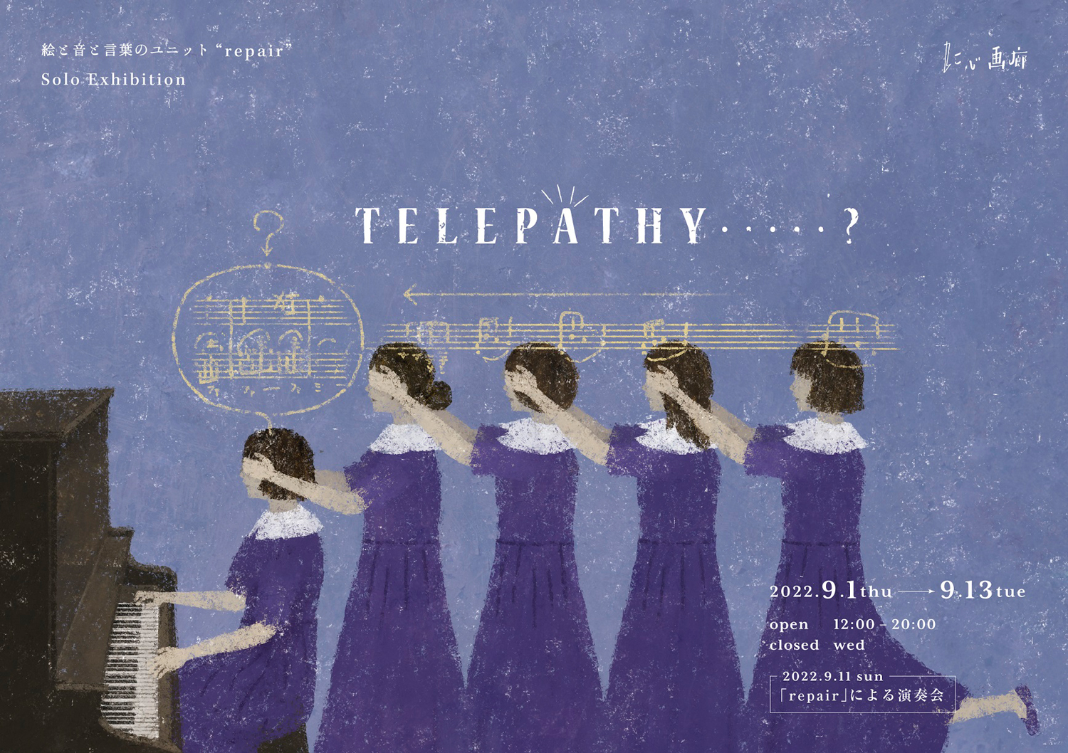 イラストとトロンボーンを担当する日下 明と、ピアノと言葉を担当する谷口有佳による“絵と音と言葉のユニット”repairが、エキシビション「TELEPATHY.....?」を東京・吉祥寺 にじ画廊にて9月1日(木)から13日(火)まで開催。