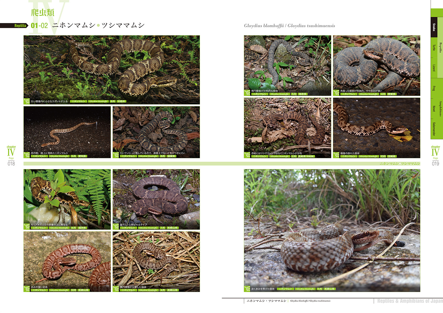 同書は、20余年に亘って野生 / 飼育下問わず爬虫類 / 両生類の撮影を続ける川添の写真を全編にフィーチャー。同種でも色や形質で細かく異なる亜種 / 地域個体群なども精緻に解説しています。