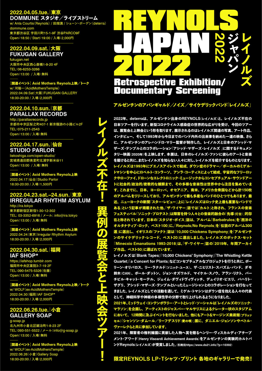 好評を博した4月5日のDOMMUNE特番に続くツアーは、4月9日(土)大阪・西心斎橋 FUKUGAN GALLERY、4月10日(日)京都・河原町三条 PARALLAX RECORDS、4月17日(日)宮城・仙台 STUDIO PARLOR、4月23日(土) / 24日(日)東京・新宿 Irregular Rhythm Asylum、4月30日(土)福岡・薬院 IAF SHOP*、6月26日(日)福岡・小倉 Gallery Soapの6都市7公演。いずれも入場無料。大阪、宮城、東京、福岡公演では関連イベントとして、ACID MOTHERS TEMPLEとのコラボレーションで制作されたアレハンドロ・マリー監督の映画『Acid Mothers Reynols: Live and Beyond』(2020)を上映(有料)。大阪では河端 一(ACID MOTHERS TEMPLE)、福岡ではWolf(ex-ACID MOTHERS TEMPLE)によるトークも予定されています。