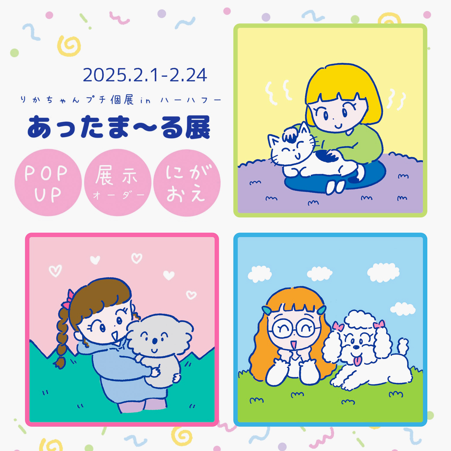 昨年12月に個展「へんしん!」を東京・吉祥寺 にじ画廊 1F ギャラリーにて開催したイラストレーター・りかちゃんが、“プチ個展”「あったま~る展」を東京・目黒のドッグ・フォト・スタジオ / ギャラリー「ハーハフー」にて2月1日(土)から24日(月・祝)まで開催。