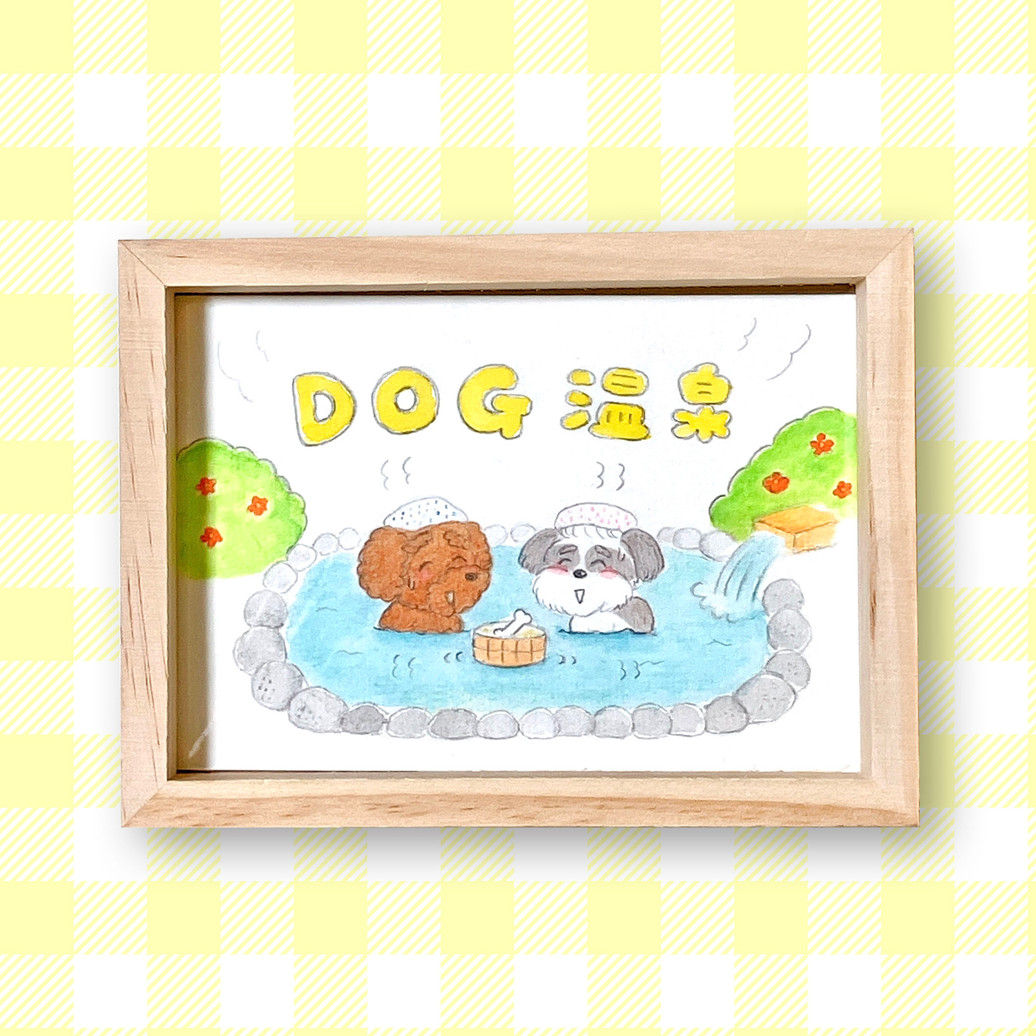 2匹の猫と暮らし、動物を描いた作品も多いりかちゃん。「あったま~る展」では、手ぬぐいを頭に乗せた犬2匹が湯に浸かる様子を描いた『DOG温泉』をはじめとする動物主体の絵画に加え、飼い主と動物を描いた事前受注作品も展示。ステッカー、Tシャツ、スウェット、帽子などのアイテムも販売されます。会期中の1日(土)、11日(火・祝)、23日(日)には「似顔絵イベント」実施(要予約)。