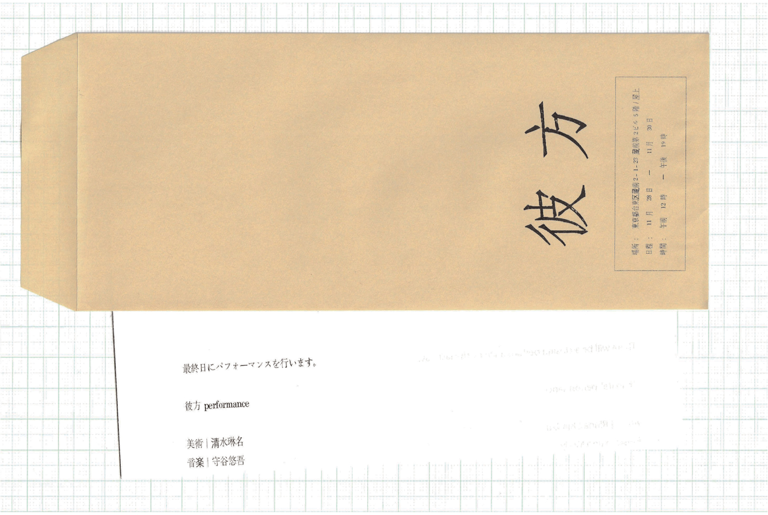 昨年11月に行われた清水と伊藤誠一朗によるパフォーマティヴ・インスタレーション「光の原液」に連なるパフォーマンス / 映像でも共作を果たしている清水と守谷。「彼方」は、音を用いて空間の認識を不可視のエリアにまで変容させる試み。パフォーマンス(有料)は最終日11月30日(土)に3公演が予定されています。チケットは清水のオンライン・ストアにて販売。