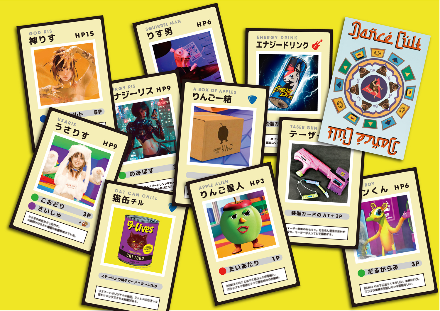 「ライヴ会場でやったアトラクションの第1弾が、缶バッジや限定音源入りのUSBメモリが取れるUFOキャッチャーだったんです。Nessくんが、ちっちゃいオモチャの機械を貸してくれて。ただ物販に買い物に来るだけよりも、みんなでワイワイ楽しく、取れない子に取ってあげるとか、ふたつ取れた人が1個あげるとか、お客さん同士で仲良くなったり。1人で来ているお客さんが多かったけど、ライヴのアフター・パーティに置いたら、すっごい楽しそうにみんなやってくれたから、これはいいなあと思ったのが最初でした。その次には射的をやって……“TASER ME”はテーザーガンで私を撃ってという曲で、お尻のジャケットなのですが、そのお尻をマトにして当たりマークのところに当てたら1等とか、それこそCORNER PRINTINGで作ったアクスタをマトにして倒したらもらえるっていうのをやったのがアトラクション第2弾。そして、その流れで新登場したアトラクションがトレーディング・カードです。MVにいろんなキャラクターがいっぱい出てくるので、そういうのを入れて、ちゃんと遊べるオリジナル・ルールのゲームを開発しました」