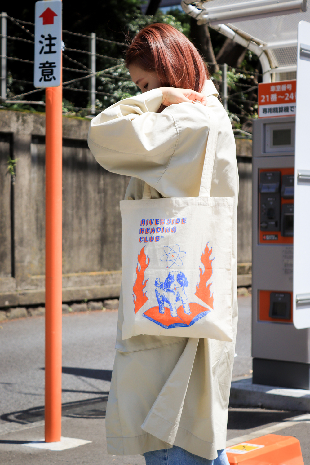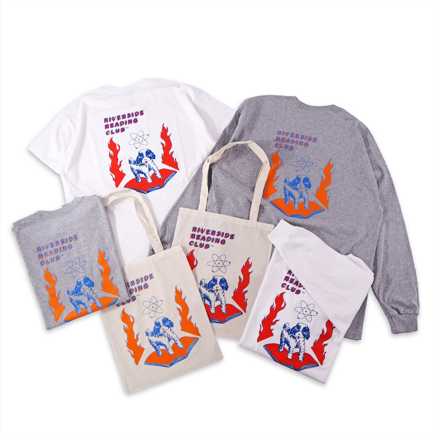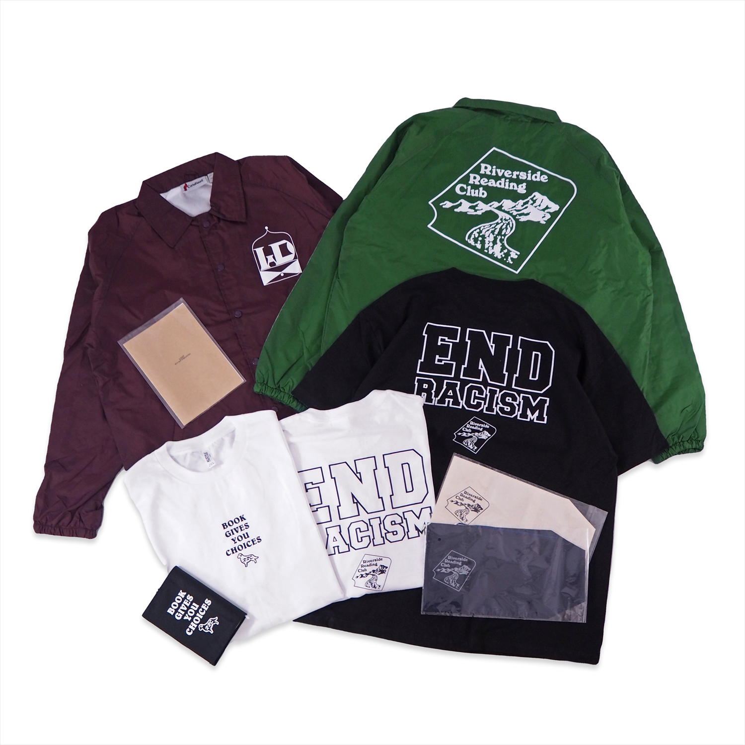 同店では、Riverside Reading Clubメンバー・KTYL(MOONSCAPE, PAYBACK BOYS, YOUNG LIZARD)によるイラストをあしらったショート / ロングスリーヴTシャツ、メンバー・ikmによるアイコニックな“End Racism”ワードをプリントしたTシャツ、トートバッグ、「Riverside Reading Club」ロゴとメンバー・Lil Mercy(PAYBACK BOYS)が主宰するレーベル「WDsounds」のロゴが入ったコーチジャケットなどのアイテムに加え、ジンも販売されます。当初販売されていたブックカバーは好評につき、すでにソールドアウト。