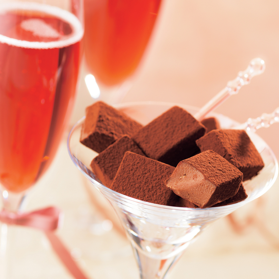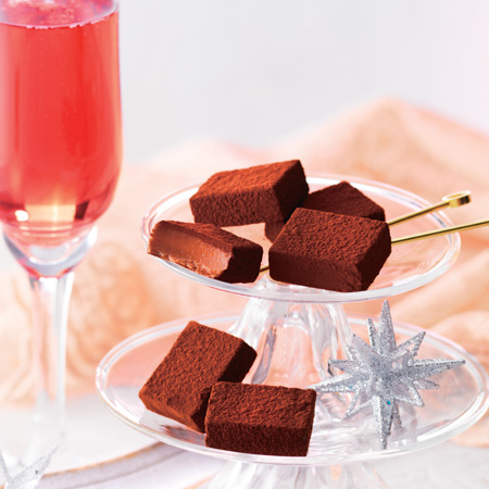 シャンパンとカシスリキュールでつくられる、美しいルビー色のカクテル「キールロワイヤル」。ほんのり甘酸っぱくてフルーティな味わいを生チョコレートにしました。洗練された優雅なおいしさは、バレンタインデーにぴったりです。