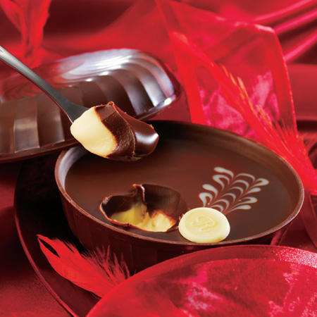 熟成された赤ワインとカカオが深く香るチョコレートでつくった層、蜜のように香り高い貴腐ワインとホワイトチョコレートでつくった層。二層の生チョコレートを重ねて、チョコレートでつくった器に入れました。