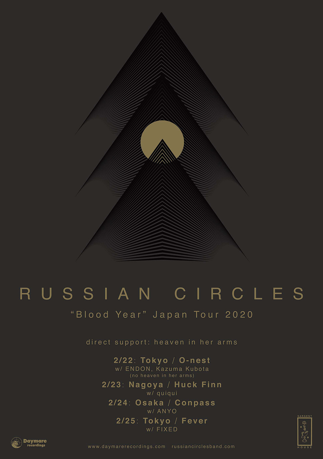 昨夏発表した『Guidance』(2016)以来のフル・アルバム『Blood Year』が好評を博した米イリノイ・シカゴ拠点のインストゥルメンタル・ヘヴィロック・トリオRUSSIAN CIRCLES(Brian Cook + Dave Turncrantz + Mike Sullivan)が、「leave them all behind 2014」出演での初来日以来約6年ぶりに来日。東名阪のジャパン・ツアーが2月22日(土)からスタートします。