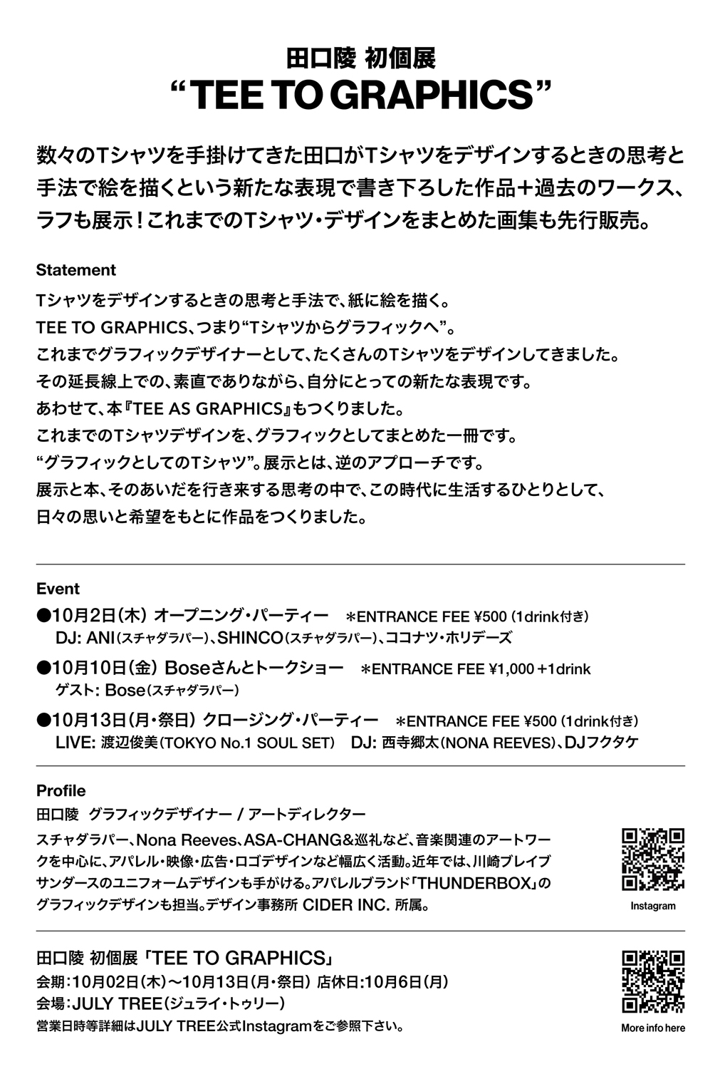 2008年からスチャダラパーのアートワークを手掛け、ASA-CHANG & 巡礼、Nona Reeves、野宮真貴、Pearl & the Oysters、一十三十一ら音楽関連を中心に、アパレル、映像、広告、ロゴなどを幅広く手掛けるグラフィックデザイナー / アートディレクター・田口 陵(CIDER INC.)が、初のエキシビション「TEE TO GRAPHICS」を東京・神泉 JULY TREEにて10月2日(木)から13日(月・祝)まで開催。