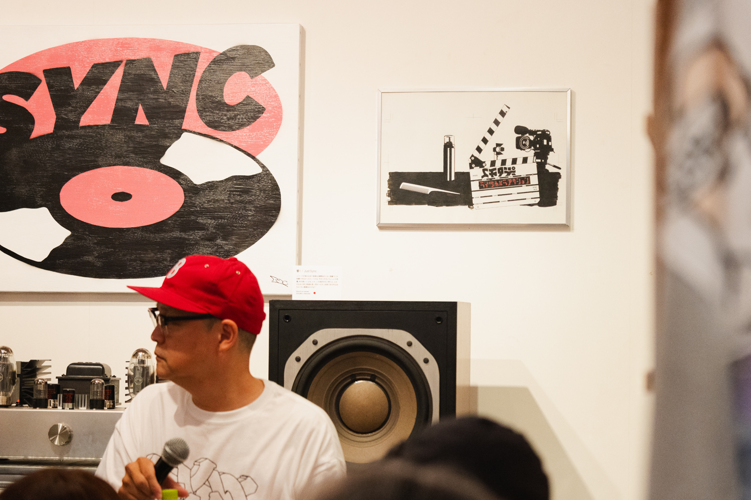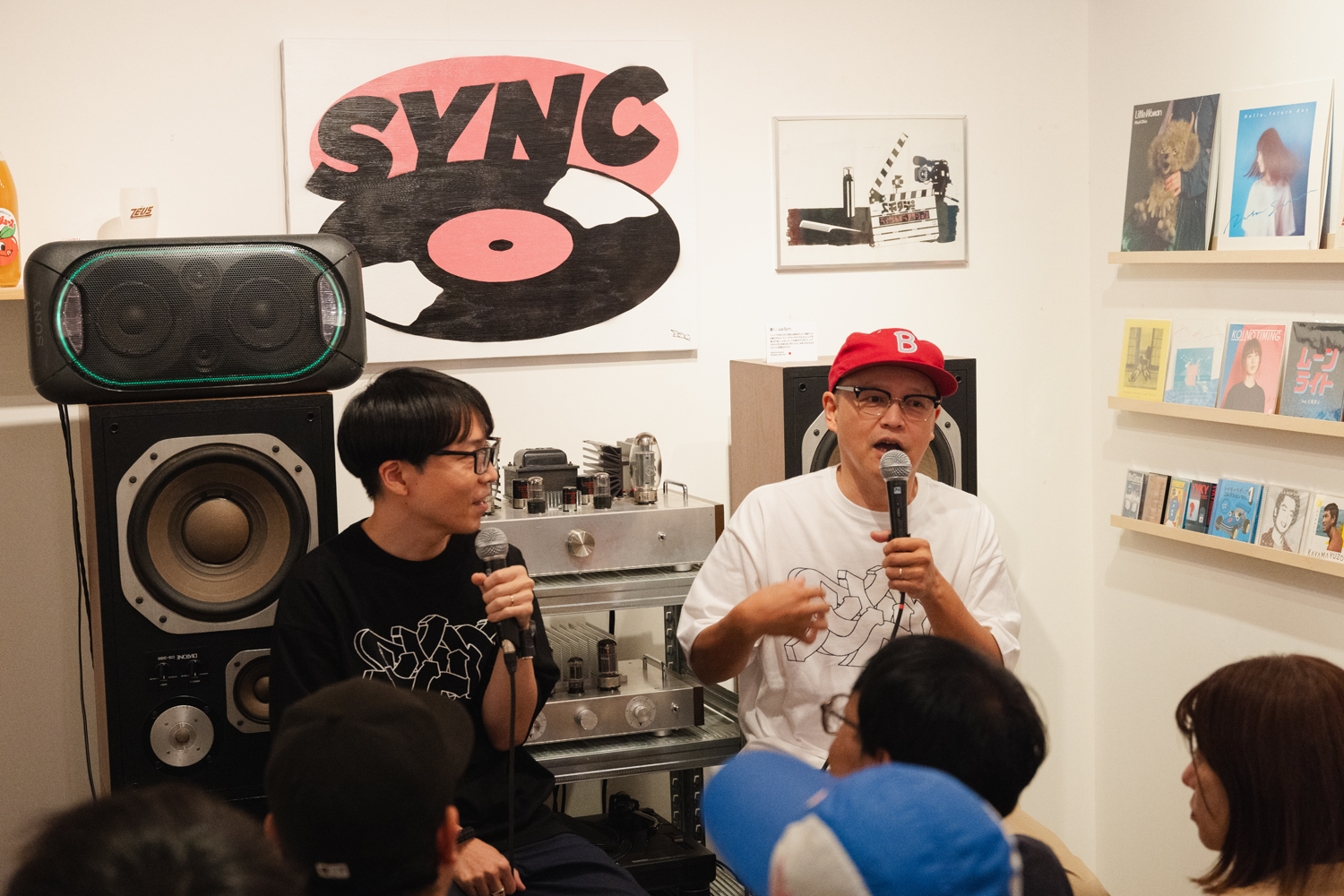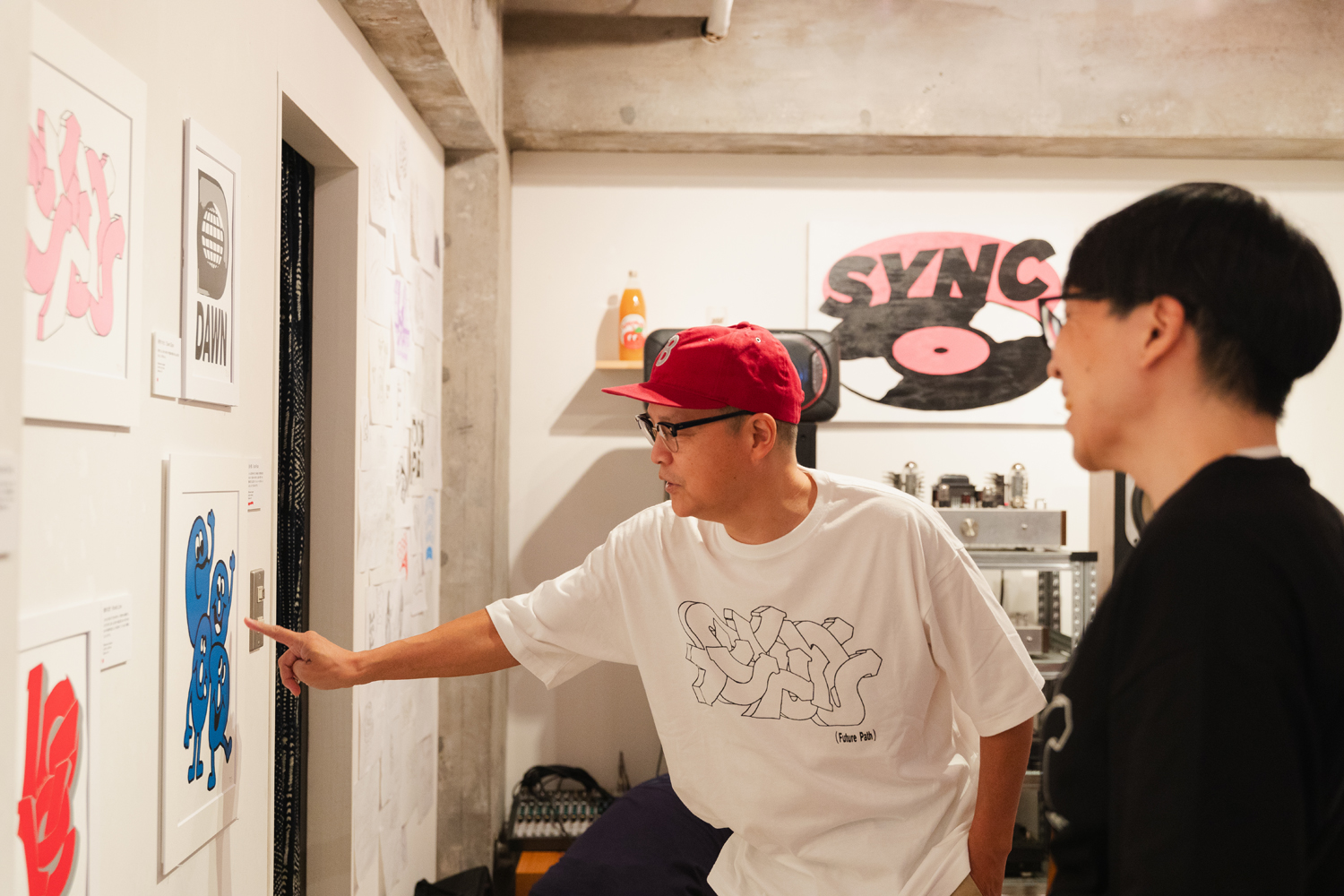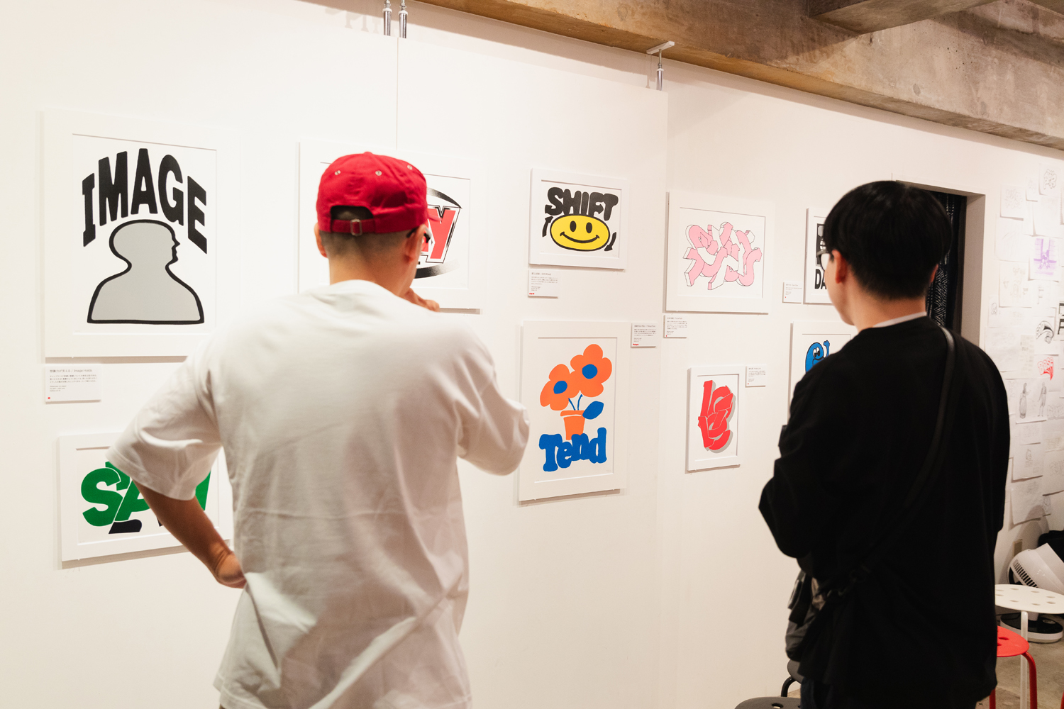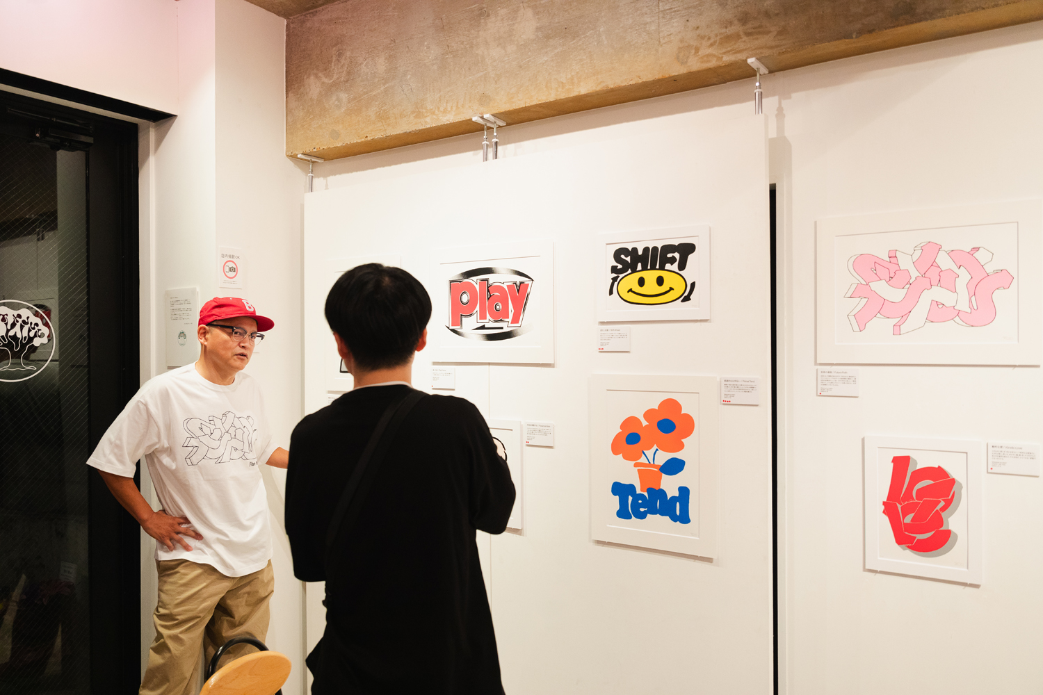 本稿は、田口が長年に亘りカヴァー・アートやマーチャンダイズを担当しているスチャダラパーのメンバー・Boseをゲストに迎えて行われた会期中のトークショウの模様。同展開催前のインタビューでは、10代だった1990年代にスチャダラパー、電気グルーヴ、Cornelius、ピチカート・ファイヴなどの音楽に影響を受け、それらのカヴァー・アートや映像などを“アーティストの一員のよう”に制作しているSKATE THING(C.E)、北山雅和、タケイグッドマンらに憧れていたという田口(以下 T)が、Bose(以下 B)と共に、初個展についてはもちろん、両者の出会いやスチャダラパーのマーチャンダイズ制作秘話などを語った。