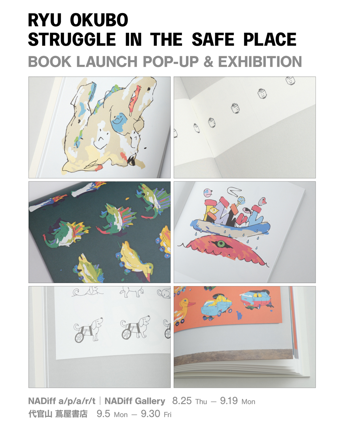 4月に3rd作品集『STRUGGLE IN THE SAFE PLACE』を「L AND C」より刊行した美術家・オオクボリュウが、同書の刊行記念ポップアップ・イベント「RYU OKUBO / STRUGGLE IN THE SAFE PLACE BOOK LAUNCH POP-UP & EXHIBITION」を8月25日(木)から9月19日(月・祝)まで東京・恵比寿 NADiff a/p/a/r/t、9月5日(月)から9月30日(金)まで東京・代官山 蔦屋書店にて開催。