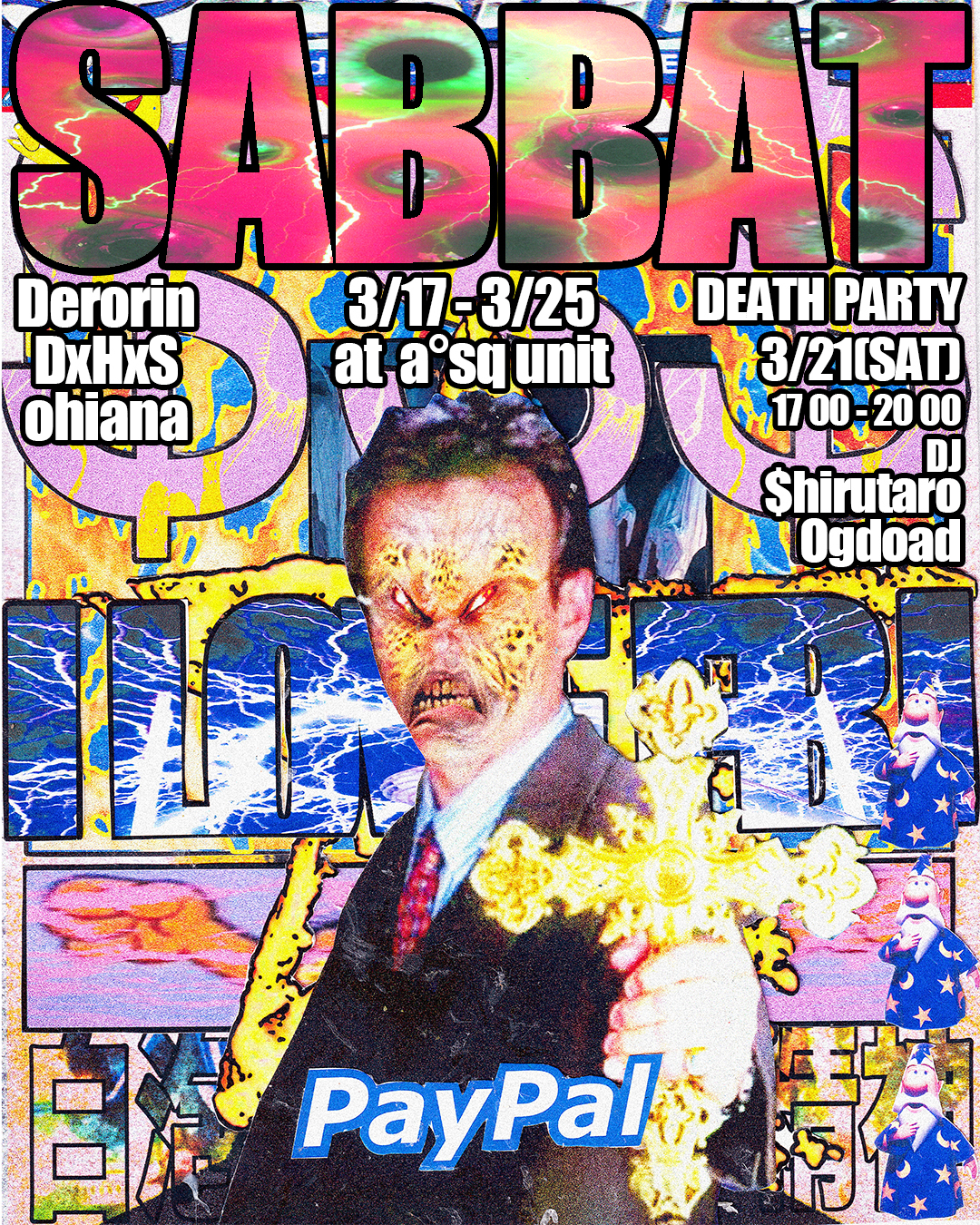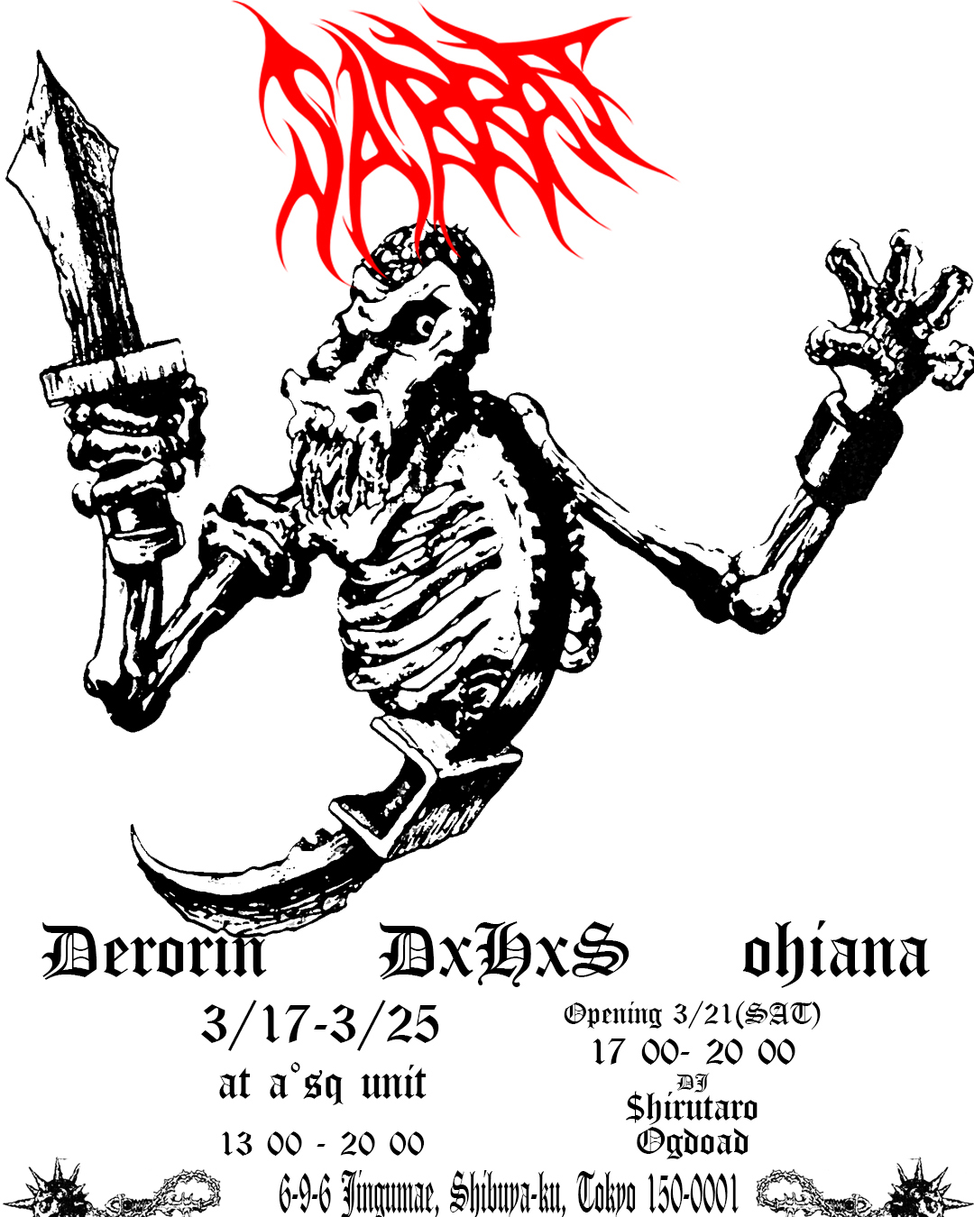 DC、falls、FESTERDECAY、KRUELTY、SANDなどのヴィジュアルを手掛けるDerorin、moreru、TORTURE SMILE、YENFORなどのアートワークで知られ、ANALSKULLFUCKのドラマーとしても活動するDxHxS、昨年の個展「Okura Natto」が好評を博したウェア・ブランド「A.C.C」ファウンダー・ohianaが、グループ・エキシビション「SABBAT」を3月17日(火)から25日(水)にかけて東京・原宿 a°sq unitにて開催。