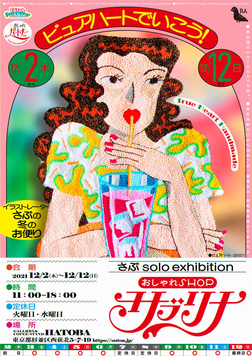 昨年10月に絵画メインの個展「さぶ展」を東京・吉祥寺 にじ画廊で開催した“さぶ”が、ソロ・エキシビション「おしゃれSHOPサブリナ」を12月2日(木)から12(日)まで東京・西荻窪 HATOBAで開催。