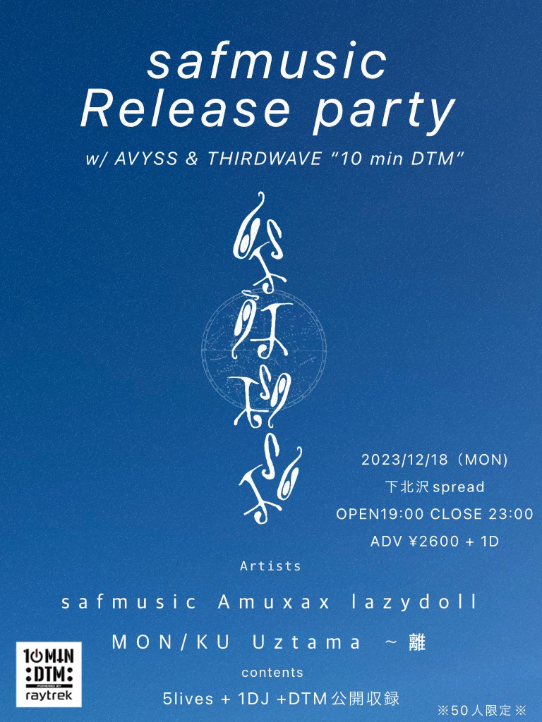 同公演では、safmusicやAmuxax、lazydoll、MON/KU、~離、Uztamaのライヴ・パフォーマンスに加え、クリエイター・スペックのPCブランド「raytrek」(株式会社サードウェーブ)と佐久間信行 aka CVN主宰メディア「AVYSS」によるドキュメンタリー・プログラムの公開収録も実施。収録内容は、10分間での楽曲制作にフォーカスしたシリーズ「10min DTM」の一環として後日「raytrek」のYouTubeチャンネルにて公開が予定されています。