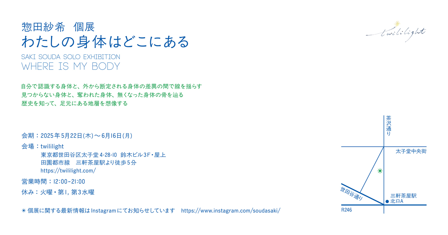 栃木・足利を拠点に活動し、清涼感を伴う線と視点で主題を高強度に描き出すイラストレーターとしてのみならず、書籍 / 雑誌、フライヤー・アートや音楽作品のカヴァー・アートなどを数多く手掛けるグラフィック・デザイナーとしても知られる惣田紗希が、ソロ・エキシビション「わたしの身体はどこにある」を5月22日(木)から6月16日(月)にかけて東京・三軒茶屋の書店「twililight」にて開催。