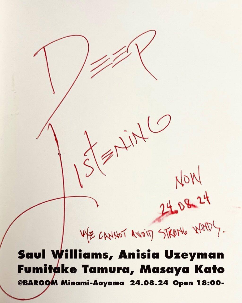 8月16日(金)にSaul WilliamsとAnisia Uzeymanを迎えての開催が予定されながらも、台風7号の影響により中止となったイベント「DEEP Listening」が、タイトルも新たに「DEEP Listening, NOW.」として8月24日(土)に東京・南青山 BAROOMにて同ラインナップで開催されます。当日に先駆けて公開されているフライヤー・アートは、Williams直筆のメッセージをあしらったもの。