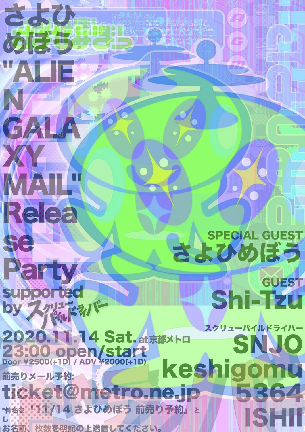 CLUB METROで随時開催中のパーティ「スクリューパイルドライバー」のサポートにより、『ALIEN GALAXY MAIL』のリリース・パーティを兼ねて開催される同イベントに、さよひめぼうはスペシャル・ゲストとして出演。ゲストにはShi-Tzu(パソコン音楽クラブ)を迎え、「スクリューパイルドライバー」のレギュラー・メンバーSNJO、keshigomu、5364、ISHIIの出演も決定しています。