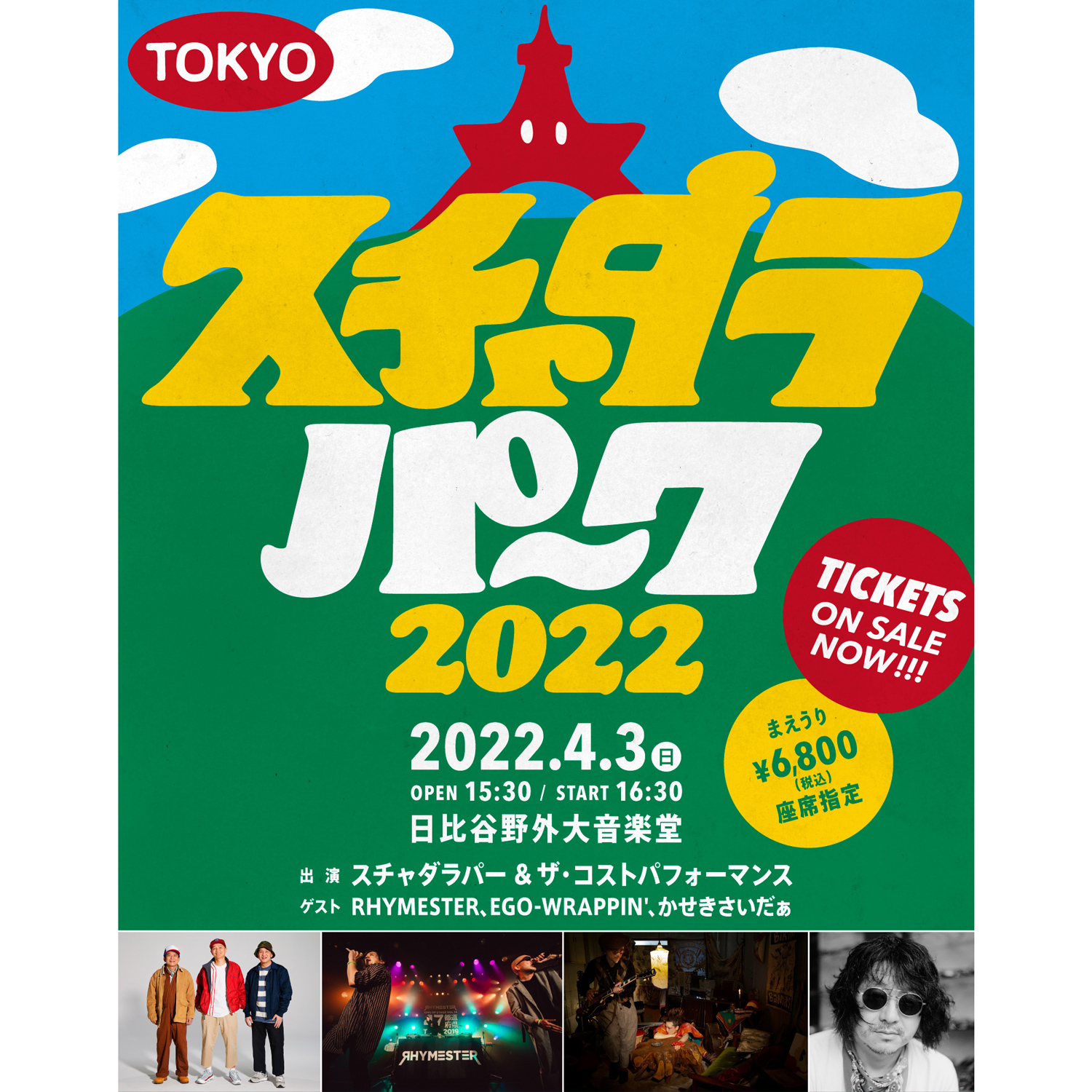 4月3日(日)の東京公演はスチャダラパーがバックバンド“ザ・コストパフォーマンス”と共に出演するほか、目下最新アルバム『シン・スチャダラ大作戦』に参加したRHYMESTER、EGO-WRAPPIN’、かせきさいだぁもゲスト出演。大阪公演はチケットのオフィシャル先行予約を4月4日(月)23:59まで受付。一般販売は4月16日(土)10:00より開始されます。