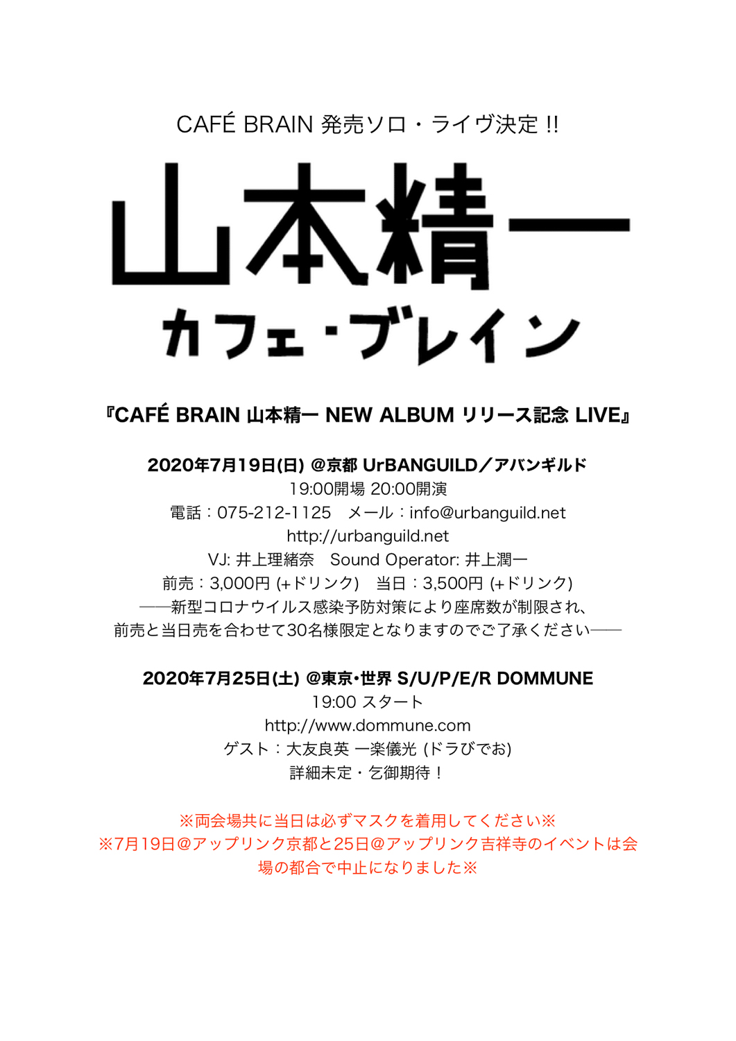 7月19日(日)に京都・木屋町 UrBANGUILDで開催される京都公演は、山本単身による完全ワンマン・ライヴ。25日(土)の東京・渋谷 S/U/P/E/R DOMMUNE公演には、大友良英、一楽儀光らのゲスト出演が予定されています。詳細はTBA。