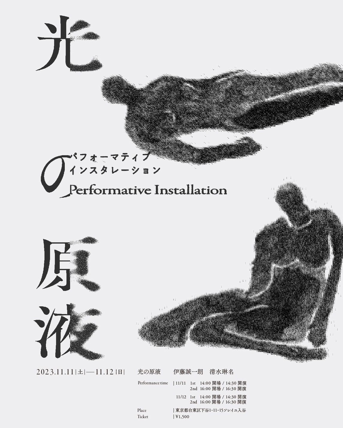 衣装、立体作品、パフォーミングアーツなどを多角的に用いた表現で知られる伊藤誠一朗と、bedcover!!、中野ミホらの映像作品でアートディレクターを務める清水琳名が、パフォーマティヴ・インスタレーション「光の原液」を11月11日(日)、12日(日)に東京・ソレイユ入谷にて開催。
