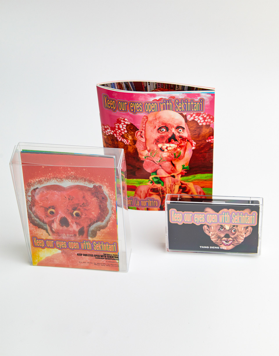 同展ではセキンタニの新作を展示販売するほか、「TANG DENG」より新作マーチャンダイズを『Keep our eyes open with Sekintani』と題して発売。MARUOSAがセキンタニのために制作した新作アルバムを収録する9曲入りのカセットテープ、セキンタニの作品を60頁に亘って収めたアートブック、レンチキュラー・カード8枚セットの3種がラインナップしています。