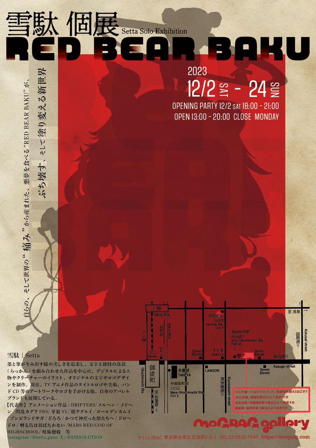 『ドリフターズ』『牙狼-GARO- -VANISHING LINE-』『呪術廻戦』といったアニメーション作品のイラスト、デザイン、筆文字などを手掛け、アパレル・ブランド「業號(ニゴウ)」のデザイナーも務めるクリエイター・雪駄が、ソロ・エキシビション「RED BEAR BAKU」を東京・新御徒町 mograg galleryにて12月2日(土)から24日(日)まで開催。
