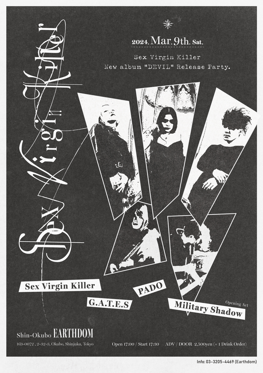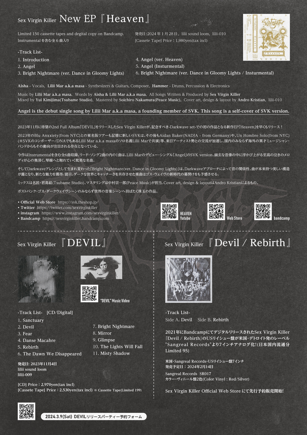 1stアルバム『VAZINISM』(2017)以来約6年ぶりのフル・アルバム『DEVIL』を昨年11月に発表し、今年1月にリリースしたダークウェイヴ・セットでの初作品『Heaven』も好評を博しているSex Virgin Killerが、アルバムのリリース・パーティを3月9日(土)に東京 新大久保 EARTHDOMにて開催。