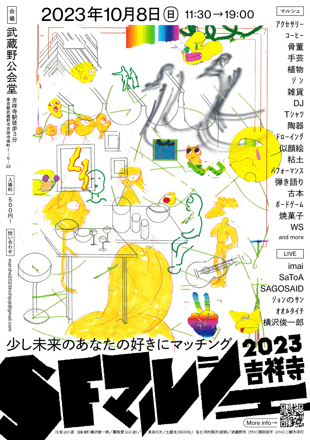 ライヴは横沢のほか、imai、ジョンのサン、オオルタイチ、SAGOSAID、SaToAが1Fのホール、ホノベミナミ、ろくろ、リれん、わがつまが2F、第1和室「弾き語りの部屋」にて出演。雑貨、食品、ワークショップなど多様な店舗が出店する「SFマルシェ」(2F 第1, 第2会議室 / 3F 第3, 第4会議室)には、碧衣スイミングの「すいみんショップ」、亜蘭トーチカ、東京・高円寺「新しい人」、「網の店おおやま」、會本久美子(ワークショップ)、「古本泡山」、GO MAYUMI、「iyei」、金中高貴、「マレ」、むくり、『neoコーキョー』 x 「苗床商店」、大木花帆、「芝生」(白波多カミン)、浦 裕幸、「余地」、「WUEI」が出店。河村実月主宰「居間」がプロデュースするマルシェ「居間の部屋」(2F 第1和室)には、阿部龍一、「珈琲ヤマグチ」、市林佳祐、市川絢菜、JACK KIMURA、Kawai Yutaka、菊池勇生、神奈川「三崎の雑貨屋HAPPENING」、momo、「only child club」、「SKITTLES STUDY GROUP」、たざきたかなり、「東京徘徊倶楽部」、「つちや温水プール」、「(TT) press」が出店。なお、出店者は今後も追加発表が予定されてます。