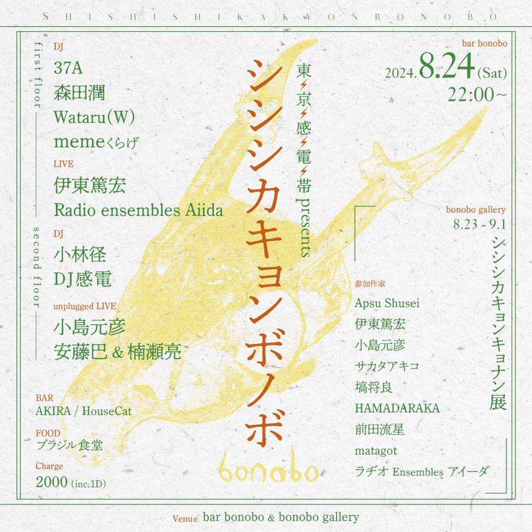 初日8月23日(金)は19:00より作家在廊。24日(土)には、オープニング・イベント「シシシカキョンボノボ」の開催も決定しています。