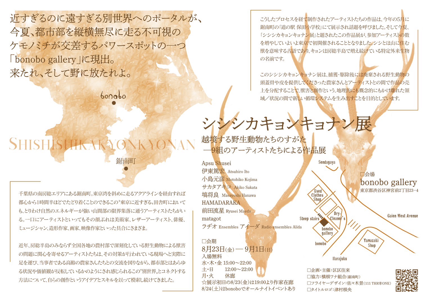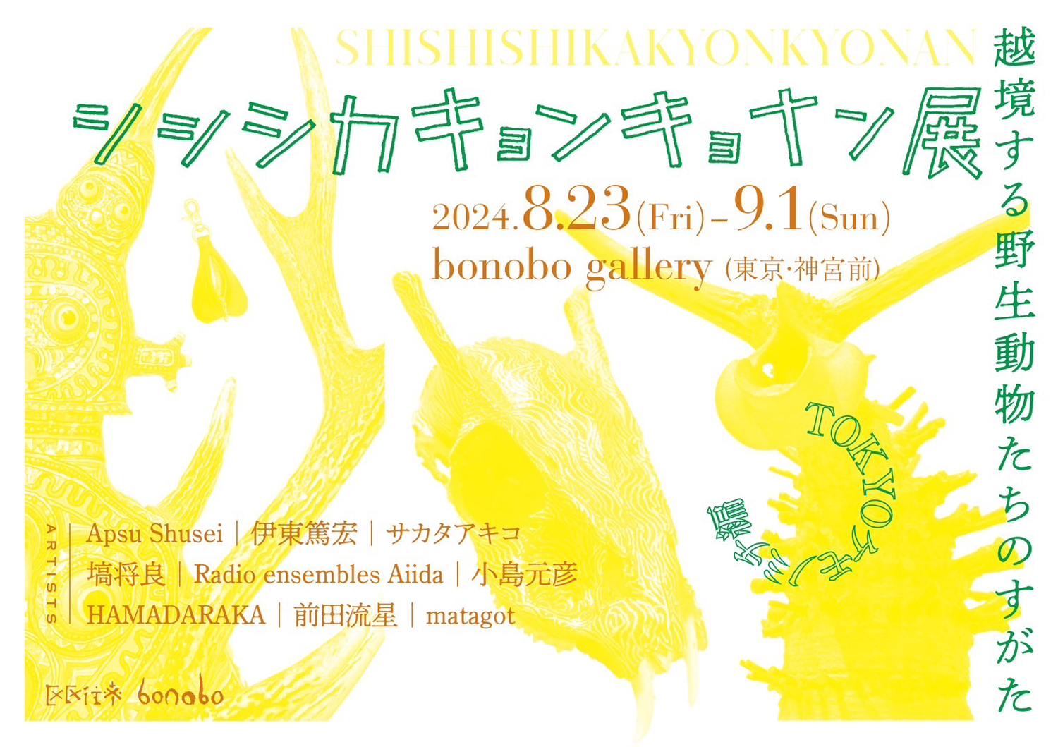 今年4月から5月にかけて千葉・鋸南町にて開催され、“獣害”の駆除とその影響にフォーカスした展示内容で注目を浴びたグループ・エキシビション「シシシカキョンキョナン展」が、東京に巡回。出展作家を増員し、8月23日(金)から9月1日(日)にかけて東京・神宮前 bonobo galleryにて開催されます。